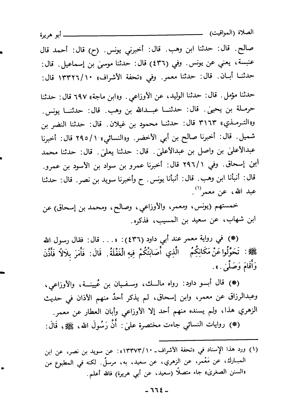 صالح، حدَّثنا ابن وهب، أخبرني يونس (ح) قال أحمد: قال عنبسة: يعني عن يونس. وفي (٤٣٦) قال: حدَّثنا موسى بن إسماعيل، حدَّثنا أبان، حدَّثنا معمر. وفي ("تحفة الأشراف") قال: حدَّثنا مؤمل، قال: حدَّثنا الوليد، عن الأوزاعي. و ((ابن ماجة))]] ٦٩٧ قال: حدَّثنا حرملة بن يحيى، حدَّثنا عبد الله بن وهب، حدَّثنا يونس. و ((التِّرمِذي))]] ٣١٦٣ قال: حدَّثنا محمود بن غيلان، حدَّثنا النضر بن شميل، أَخْبَرنا صالح بن أبي الأخضر. و ((النَّسائي))]] ١/ ٢٩٥ قال: أَخْبَرنا عبد الأعلى بن واصل بن عبد الأعلى، قال: حدَّثنا يعلى، قال: حدَّثنا محمد بن إسحاق. وفي ١/ ٢٩٦ قال: أَخْبَرنا عمرو بن سواد بن الأسود بن عمرو، قال: أنبأنا ابن وهب، قال: أنبأنا يونس. و ((ابن حبان))]] ٢٠٦٩ قال: أَخْبَرنا محمد بن الحسن بن قتيبة، والحسن بن سفيان، قالا: حدثنا حرملة بن يحيى، قال: حدثنا ابن وهب، قال: أَخْبَرنا يونس.