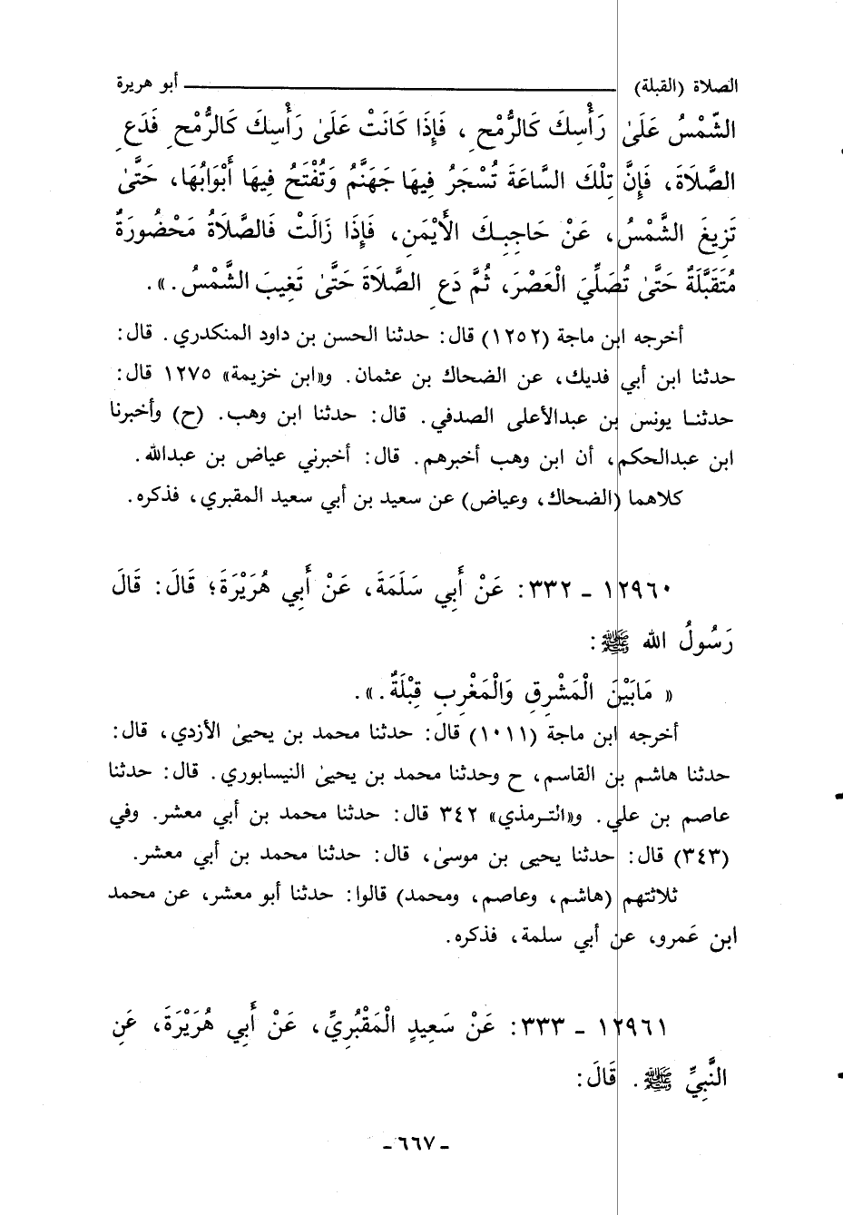 - وفي رواية: " (أَنَّ رَجُلاً أَتَى رَسُولَ اللهِ صلى الله عليه وسلم، فَقَالَ: يَا رَسُولَ اللهِ، أَيُّ سَاعَاتِ اللَّيْلِ وَالنَّهَارِ سَاعَةً تَأْمُرُنِي أَنْ لَا أُصَلِّي فِيهَا؟ فَقَالَ رَسُولُ اللهِ صلى الله عليه وسلم: إِذَا صَلَّيْتَ الصُّبْحَ، فَأَقْصِرْ عَنِ الصَّلَاةِ، حَتَّى تَرْتَفِعَ الشَّمْسُ، فَإِنَّهَا تَطْلُعُ بَيْنَ قَرْنَيْ الشَّيْطَانِ، ثُمَّ الصَّلَاةُ مَشْهُودَةٌ مَحْضُورَةٌ مُتَقَبَّلَةٌ حَتَّى يَنْتَصِفَ النَّهَارُ، فَإِذَا انْتَصَفَ النَّهَارُ، فَأَقْصِرْ عَنِ الصَّلَاةِ حَتَّى تَمِيلَ الشَّمْسُ، فَإِنَّ حِينَئِذٍ تُسَعَّرُ جَهَنَّمُ، وَشِدَّةُ الْحَرِّ مِنْ فَيْحِ جَهَنَّمَ، فَإِذَا زَالَتِ الشَّمْسُ، فَالصَّلَاةُ مَحْضُورَةٌ مَشْهُودَةٌ مُتَقَبَّلَةٌ حَتَّى تُصَلِّيَ الْعَصْرَ، فَإِذَا صَلَّيْتَ الْعَصْرَ، فَأَقْصِرْ عَنِ الصَّلَاةِ، حَتَّى تَغِيبَ الشَّمْسُ، فَإِنَّهَا تَغِيبَ بَيْنَ قَرْنَيْ الشَّيْطَانِ، ثُمَّ الصَّلَاةُ مَشْهُودَةٌ مَحْضُورَةٌ مُتَقَبَّلَةٌ حَتَّى تُصَلِّيَ الصُّبْحَ.) ".