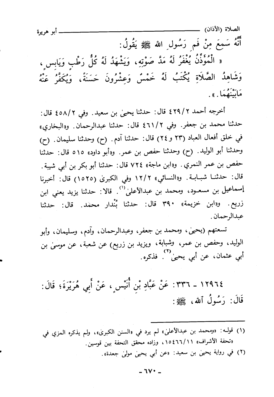 - وفي رواية: " (الْمُؤَذِّنُ يُغْفَرُ لَهُ مَدَّ صَوْتِهِ، وَيَسْتَغْفِرُ لَهُ كُلُّ رَطْبٍ وَيَابِسٍ، وَشَاهِدُ الصَّلَاةِ يُكْتَبُ لَهُ خَمْسٌ وَعِشْرُونَ حَسَنَةً، وَيُكَفَّرُ عَنْهُ مَا بَيْنَهُمَا.) ".