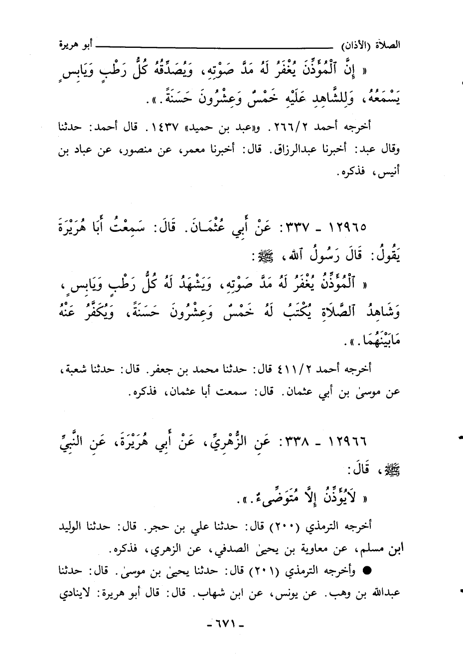 (إِنَّ الْمُؤَذِّنَ يُغْفَرُ لَهُ مَدَى صَوْتِهِ، وَيُصَدِّقُهُ كُلُّ رَطْبٍ وَيَابِسٍ سَمِعَهُ، وَالشَّاهِدُ عَلَيْهِ خَمْسَةً وَعِشْرِينَ دَرَجَةً.) ".