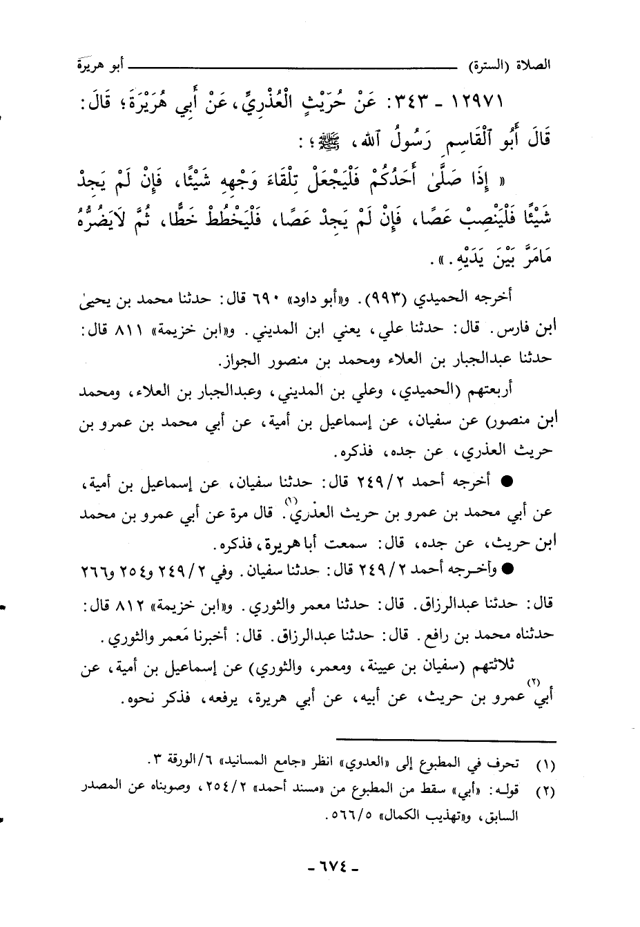 خمستهم (الحميدي، وعلي بن المديني، وعبد الجبار بن العلاء، ومحمد بن منصور، وأبو خيثمة) عن سفيان، عن إسماعيل بن أمية، عن أبي محمد بن عمرو بن حريث العذري، عن جده، فذكره.