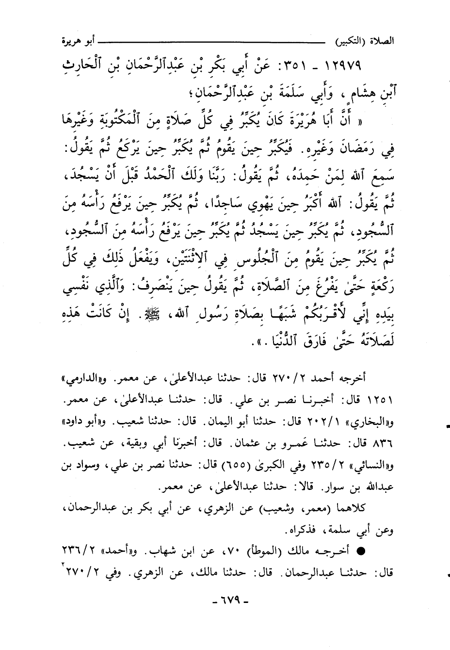 (أَنَّ أَبَا هُرَيْرَةَ كَانَ يُكَبِّرُ فِي كُلِّ صَلَاةٍ مِنَ الْمَكْتُوبَةِ وَغَيْرِهَا، فِي رَمَضَانَ وَغَيْرِهِ، فَيُكَبِّرُ حِينَ يَقُومُ، ثُمَّ يُكَبِّرُ حِينَ يَرْكَعُ، ثُمَّ يَقُولُ: سَمِعَ اللَّهُ لِمَنْ حَمِدَهُ، ثُمَّ يَقُولُ: رَبَّنَا وَلَكَ الْحَمْدُ، قَبْلَ أَنْ يَسْجُدَ، ثُمَّ يَقُولُ: اللَّهُ أَكْبَرُ حِينَ يَهْوِي سَاجِدًا، ثُمَّ يُكَبِّرُ حِينَ يَرْفَعُ رَأْسَهُ مِنَ السُّجُودِ، ثُمَّ يُكَبِّرُ حِينَ يَسْجُدُ، ثُمَّ يُكَبِّرُ حِينَ يَرْفَعُ رَأْسَهُ مِنَ السُّجُودِ، ثُمَّ يُكَبِّرُ حِينَ يَقُومُ مِنَ الْجُلُوسِ فِي الاِثْنَتَيْنِ، وَيَفْعَلُ ذَلِكَ فِى كُلِّ رَكْعَةٍ حَتَّى يَفْرُغَ مِنَ الصَّلَاةِ، ثُمَّ يَقُولُ حِينَ يَنْصَرِفُ: وَالَّذِي نَفْسِي بِيَدِهِ إِنِّي لأَقْرَبُكُمْ شَبَهًا بِصَلَاةِ رَسُولِ اللهِ صلى الله عليه وسلم، إِنْ كَانَتْ هَذِهِ لَصَلَاتَهُ حَتَّى فَارَقَ الدُّنْيَا.) ".