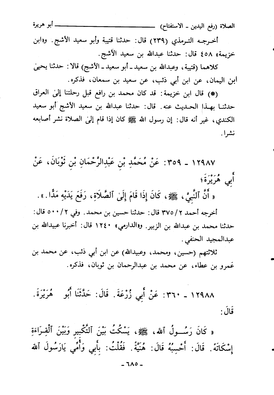 - قال أبو بكر ابن خزيمة: قد كان محمد بن رافع قبل رحلتنا إلى العراق حدَّثنا بهذا الحديث عنه، قال: حدَّثنا عبد الله بن سعيد الأشج، أبو سعيد الكندي، غير أنه قال: إن رسول الله صلى الله عليه وسلم كان إذا قام إلى الصلاة نشر أصابعه نشرًا.