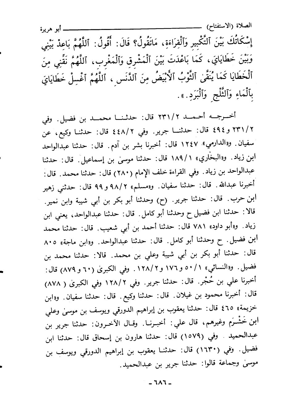 - وفي رواية: " (كَانَ رَسُولُ اللهِ صلى الله عليه وسلم إِذَا كَبَّرَ سَكَتَ بَيْنَ التَّكْبِيرِ وَالْقِرَاءَةِ، قَالَ: فَقُلْتُ: بِأَبِي أَنْتَ وَأُمِّي، أَرَأَيْتَ سُكُوتَكَ بَيْنَ التَّكْبِيرِ وَالْقِرَاءَةِ، فَأَخْبِرْنِي مَا تَقُولُ؟ قَالَ: أَقُولُ: اللَّهُمَّ بَاعِدْ بَيْنِي وَبَيْنَ خَطَايَايَ كَمَا بَاعَدْتَ بَيْنَ الْمَشْرِقِ وَالْمَغْرِبِ، اللَّهُمَّ نَقِّنِي مِنْ خَطَايَايَ كَالثَّوْبِ الأَبْيَضِ مِنَ الدَّنَسِ، اللَّهُمَّ اغْسِلْنِي مِنْ خَطَايَايَ بِالْمَاءِ وَالثَّلْجِ وَالْبَرَدِ.) ".
