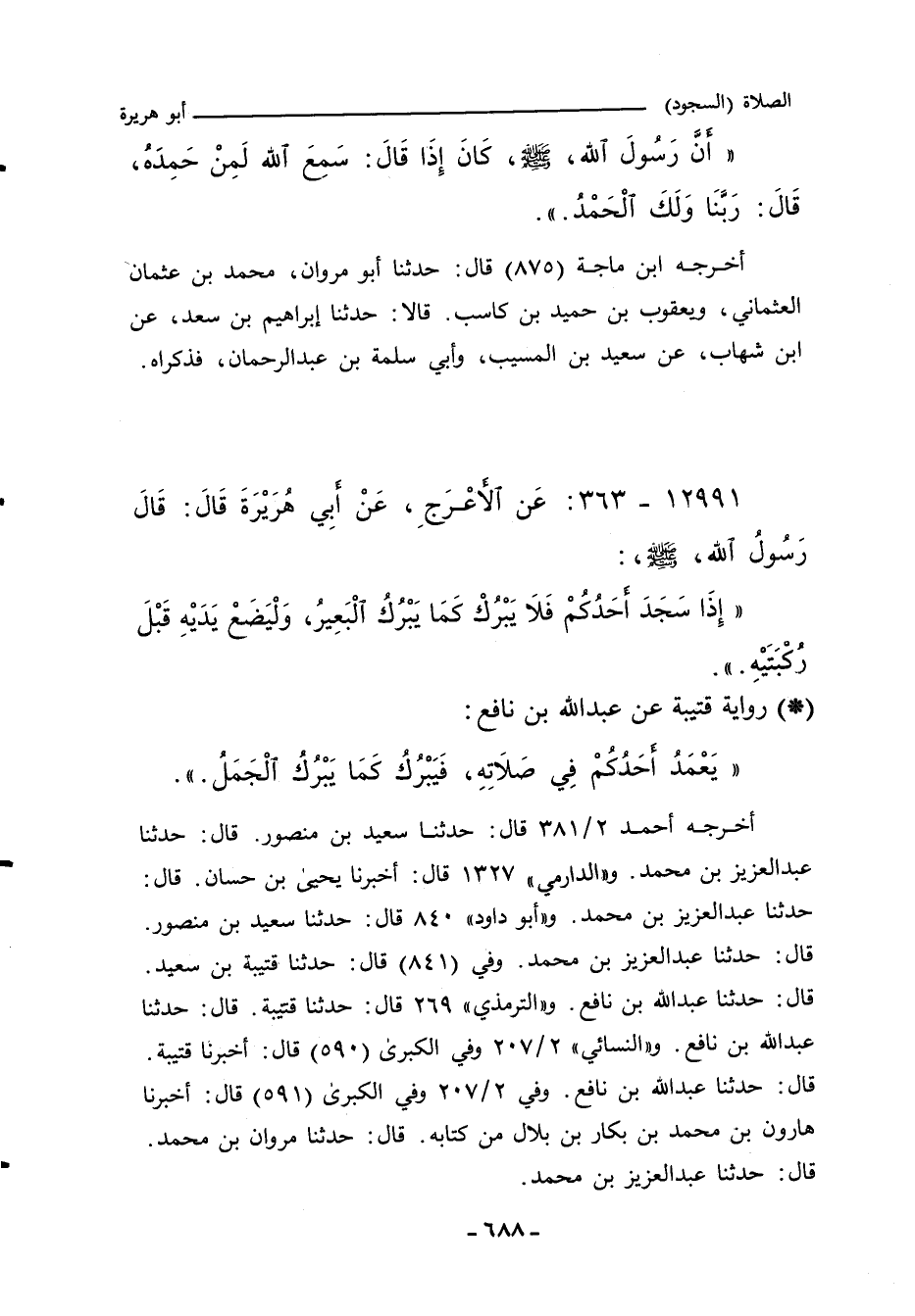 - وفي رواية: " (إِذَا سَجَدَ أَحَدُكُمْ فَلْيَضَعْ يَدَيْهِ قَبْلَ رُكْبَتَيْهِ، وَلَا يَبْرُكْ بُرُوكَ الْبَعِيرِ.) ".
