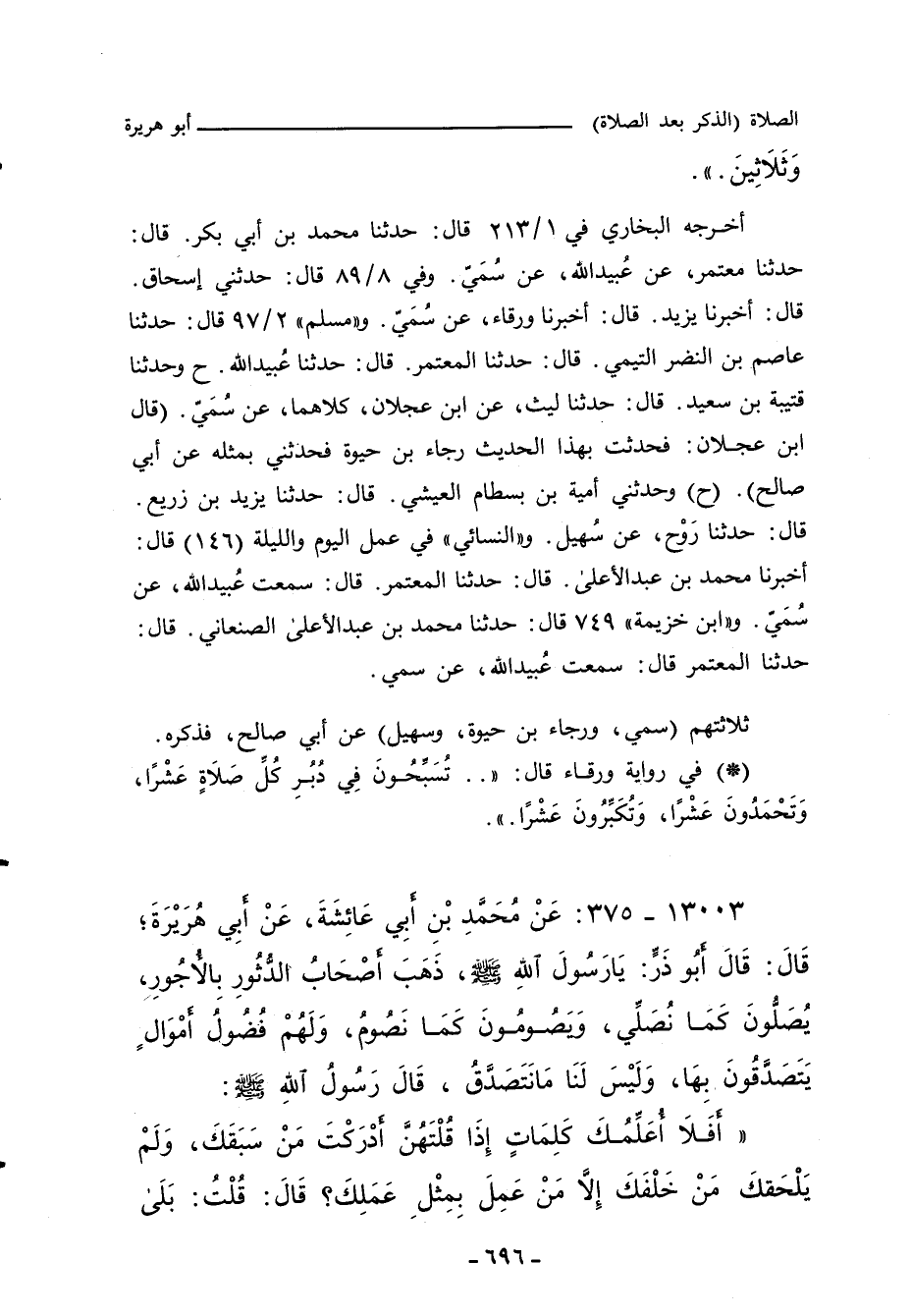 - وفي رواية: " (عَنْ رَسُولِ اللهِ صلى الله عليه وسلم، أَنَّهُمْ قَالُوا: يَا رَسُولَ اللهِ، ذَهَبَ أَهْلُ الدُّثُورِ بِالدَّرَجَاتِ الْعُلَى وَالنَّعِيمِ الْمُقِيمِ ... بِمِثْلِ حَدِيثِ قُتَيْبَةَ، عَنِ اللَّيْثِ، إِلَاّ أَنَّهُ أَدْرَجَ فِي حَدِيثِ أَبِي هُرَيْرَةَ قَوْلَ أَبِي صَالِحٍ، ثُمَّ رَجَعَ فُقَرَاءُ الْمُهَاجِرِينَ ... إِلَى آخِرِ الْحَدِيثِ.) ".