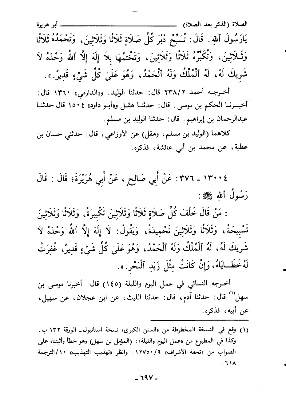 - وفي رواية: " (قَالَ أَبُو ذَرٍّ: يَا رَسُولَ اللهِ، ذَهَبَ أَصْحَابُ الدُّثُورِ بِالأُجُورِ، يُصَلُّونَ كَمَا نُصَلِّي، وَيَصُومُونَ كَمَا نَصُومُ، وَلَهُمْ فُضُولُ أَمْوَالٍ يَتَصَدَّقُونَ بِهَا، وَلَيْسَ لَنَا مَالٌ نَتَصَدَّقُ بِهِ، فَقَالَ رَسُولُ اللهِ صلى الله عليه وسلم: يَا أَبَا ذَرٍّ، أَلَا أُعَلِّمُكَ كَلِمَاتٍ تُدْرِكُ بِهِنَّ مَنْ سَبَقَكَ، وَلَا يَلْحَقُكَ مَنْ خَلْفَكَ، إِلَاّ مَنْ أَخَذَ بِمِثْلِ عَمَلِكَ، قَالَ: بَلَى يَا رَسُولَ اللهِ، قَالَ: تُكَبِّرُ اللهَ، عَزَّ وَجَلَّ، دُبُرَ كُلِّ صَلَاةٍ ثَلَاثًا وَثَلَاثِينَ، وَتَحْمَدُهُ ثَلَاثًا وَثَلَاثِينَ، وَتُسَبِّحُهُ ثَلَاثًا وَثَلَاثِينَ، وَتَخْتِمُهَا بِلَا إِلَهَ إِلَاّ اللَّهُ وَحْدَهُ لَا شَرِيكَ لَهُ، لَهُ الْمُلْكُ وَلَهُ الْحَمْدُ، وَهُوَ عَلَى كُلِّ شَيْءٍ قَدِيرٌ، غُفِرَتْ لَهُ ذُنُوبُهُ، وَلَوْ كَانَتْ مِثْلَ زَبَدِ الْبَحْرِ.) ".