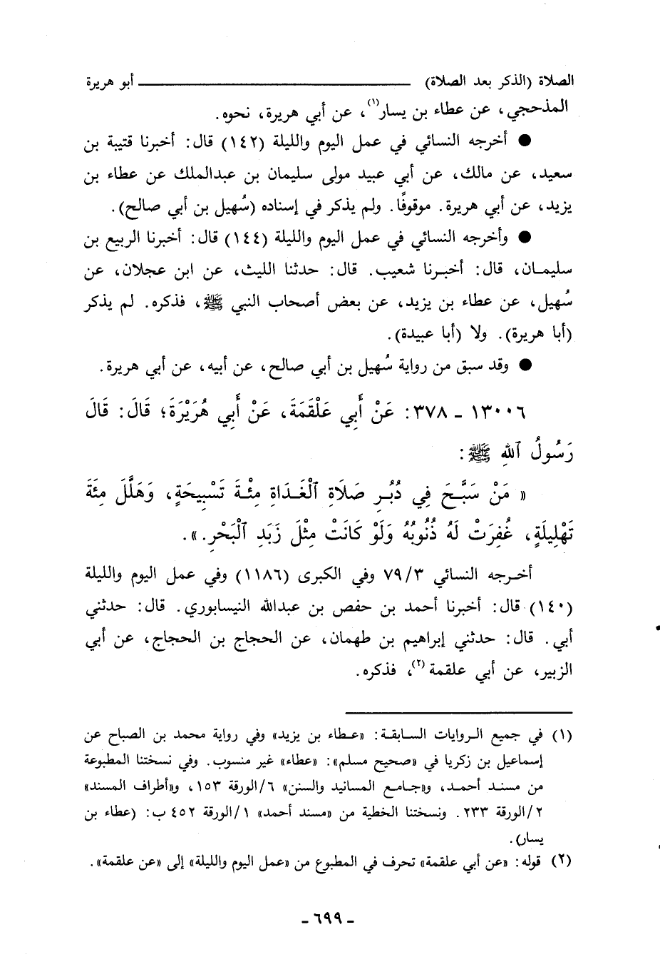 (مَنْ سَبَّحَ ثَلَاثًا وَثَلَاثِينَ، وَكَبَّرَ ثَلَاثًا وَثَلَاثِينَ، وَحَمِدَ ثَلَاثًا وَثَلَاثِينَ، وَقَالَ: لَا إِلَهَ إِلَاّ اللَّهُ، وَحْدَهُ لَا شَرِيكَ لَهُ، لَهُ الْمُلْكُ وَلَهُ الْحَمْدُ، وَهُوَ عَلَى كُلِّ شَيْءٍ قَدِيرٌ، خَلْفَ الصَّلَاةِ، غُفِرَ لَهُ ذَنْبُهُ، وَإِنْ كَانَ أَكْثَرَ مِنْ زَبَدِ الْبَحْرِ.) ".