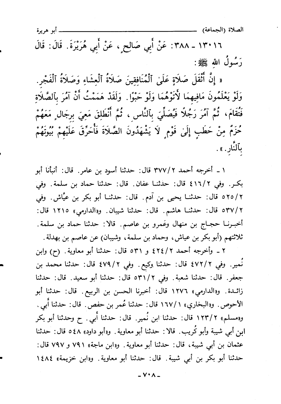 - وفي رواية: " (إِنَّ أَثْقَلَ الصَّلَاةِ عَلَى الْمُنَافِقِينَ صَلَاةُ الْعِشَاءِ الآخِرَةِ وَصَلَاةُ الْفَجْرِ، وَلَوْ يَعْلَمُونَ مَا فِيهِمَا لأَتَوْهُمَا وَلَوْ حَبْوًا، وَلَوْ عَلِمَ أَحَدُكُمْ أَنَّهُ إِذَا وَجَدَ عَرْقًا مِنْ شَاةٍ سَمِينَةٍ، أَوْ مِرْمَاتَيْنِ حَسَنَتَيْنِ، لأَتَيْتُمُوهَا أَجْمَعِينَ، لَقَدْ هَمَمْتُ أَنْ آمُرَ بِالصَّلَاةِ فَتُقَامَ، ثُمَّ آمُرَ رَجُلاً يُصَلِّي بِالنَّاسِ، ثُمَّ آخُذَ حُزَمًا مِنْ حَطَبٍ، فَآتِيَ الَّذِينَ تَخَلَّفُوا عَنِ الصَّلَاةِ، فَأُحْرِّقَ عَلَيْهِمْ بُيُوتَهُمْ.) ".