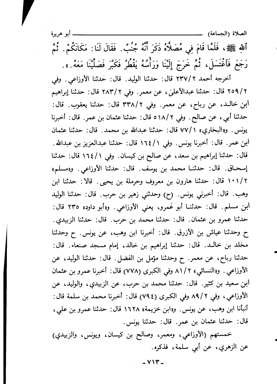 أخرجه أحمد ٢/ ٢٣٧ (٧٢٣٧) قال: حدَّثنا الوليد، حدَّثنا الأوزاعي. وفي ٢/ ٢٥٩ (٧٥٠٦) قال: حدَّثنا عبد الأعلى، عن معمر. وفي ٢/ ٢٨٣ (٧٧٩١) قال: حدَّثنا إبراهيم بن خالد، عن رباح، عن معمر. وفي ٢/ ٣٣٨ (٨٤٤٧) قال: حدَّثنا يعقوب، حدَّثنا أبي، عن صالح. وفي ٢/ ٥١٨ (١٠٧٣٠) قال: حدَّثنا عثمان بن عمر، أَخْبَرنا يونس. و ((البُخاري))]] ٢٧٥ قال: حدَّثنا عبد الله بن محمد، قال: حدَّثنا عثمان بن عمر، قال: أَخْبَرنا يونس. وفي (٦٣٩) قال: حدَّثنا عبد العزيز بن عبد الله، قال: حدَّثنا إبرهيم بن سعد، عن صالح بن كيسان. وفي (٦٤٠) قال: حدَّثنا إسحاق، قال: حدَّثنا محمد بن يوسف، قال: حدَّثنا الأوزاعي. و ((مسلم))]] ١٣٠٨ قال: حدَّثنا هارون بن معروف، وحرملة بن يحيى، قالا: حدَّثنا ابن وهب، أخبرني يونس. وفي (١٣٠٩) قال: وحدثني زهير بن حرب، حدَّثنا الوليد بن مسلم، حدَّثنا أبو عَمرو، يعني الأوزاعي. و ((أبو داود))]] ٢٣٥ قال: حدَّثنا عمرو بن عثمان، حدَّثنا محمد بن حرب، حدَّثنا الزبيدي (ح) وحدَّثنا عياش بن الأزرق، أَخْبَرنا ابن وهب، عن يونس (ح) وحدَّثنا مخلد بن خالد، حدَّثنا إبراهيم بن خالد، إمام مسجد صنعاء، حدَّثنا رباح، عن معمر (ح) وحدَّثنا مؤمل بن الفضل، حدَّثنا الوليد، عن الأوزاعي. و ((النَّسائي))]] ٢/ ٨١، وفي ((الكبرى))]] ٨٦٩ قال: أَخْبَرنا عمرو بن عثمان بن سعيد بن كثير، قال: حدَّثنا محمد بن حرب، عن الزبيدي (ح) والوليد، عن الأوزاعي، وفي ٢/ ٨٩، وفي ((الكبرى))]] ٨٨٥ قال: أَخْبَرنا محمد بن سلمة، قال: أنبأنا ابن وهب، عن يونس. و ((ابن خزيمة))]] ١٦٢٨ قال: حدَّثنا عمرو بن علي، حدَّثنا عثمان بن عمر، حدَّثنا يونس. و ((ابن حِبَّان))]] ٢٢٣٦ قال: أَخْبَرنا أبو يعلى، قال: حدَّثنا أبو خيثمة، قال: حدَّثنا يعقوب بن إبراهيم بن سعد، قال: حدَّثنا أبي، عن صالح.