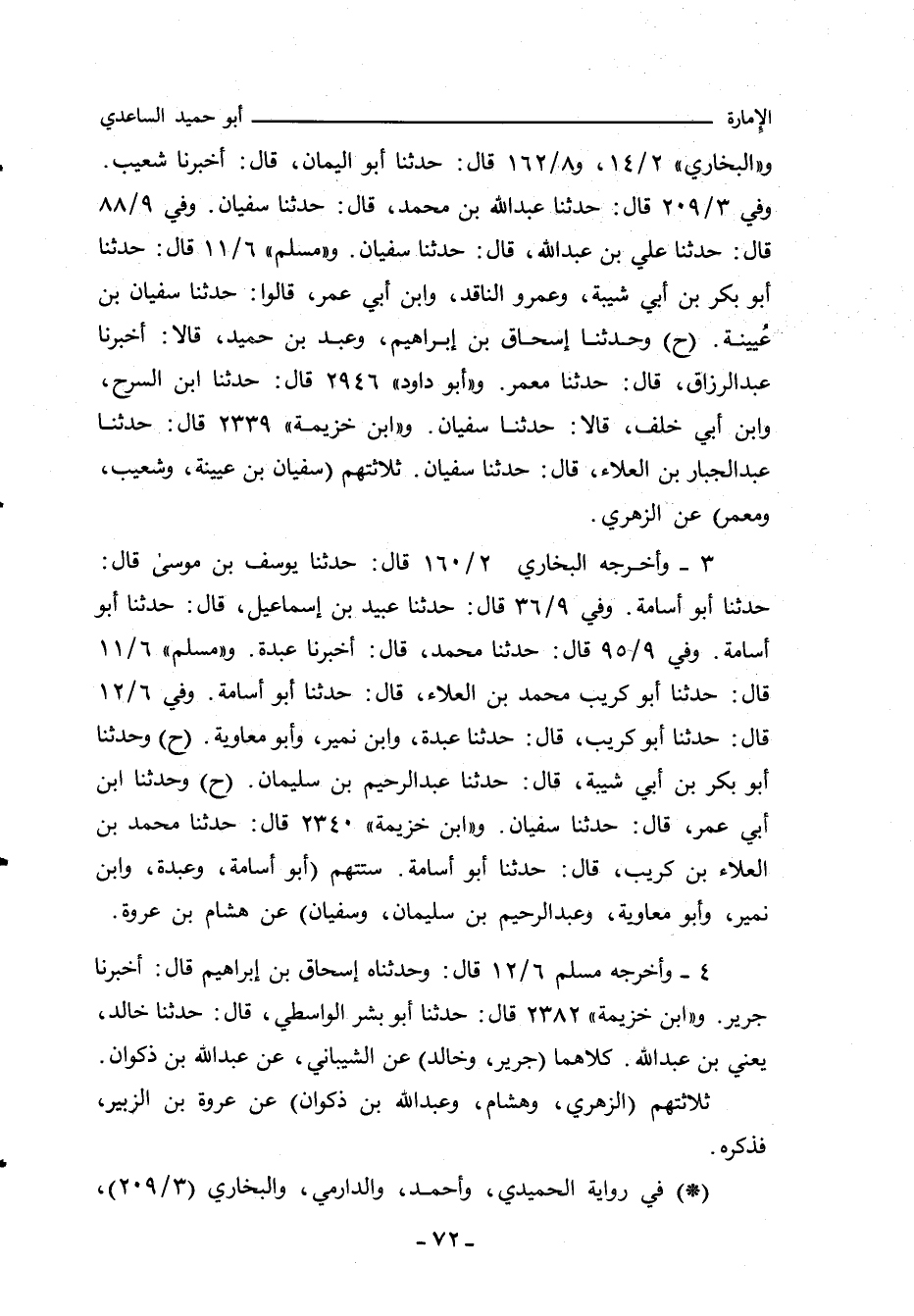 - في رواية الحميدي، قال سُفْيان: وزاد فيه هشام: قال أبو حُمَيد: فَبَصُرَتْ عَيْنِي، وَسَمِعَتْ أُذُنِي من رسول الله صلى الله عليه وسلم، وسلوا زَيْد بن ثابت، فإنَّه كان حاضرًا معي.