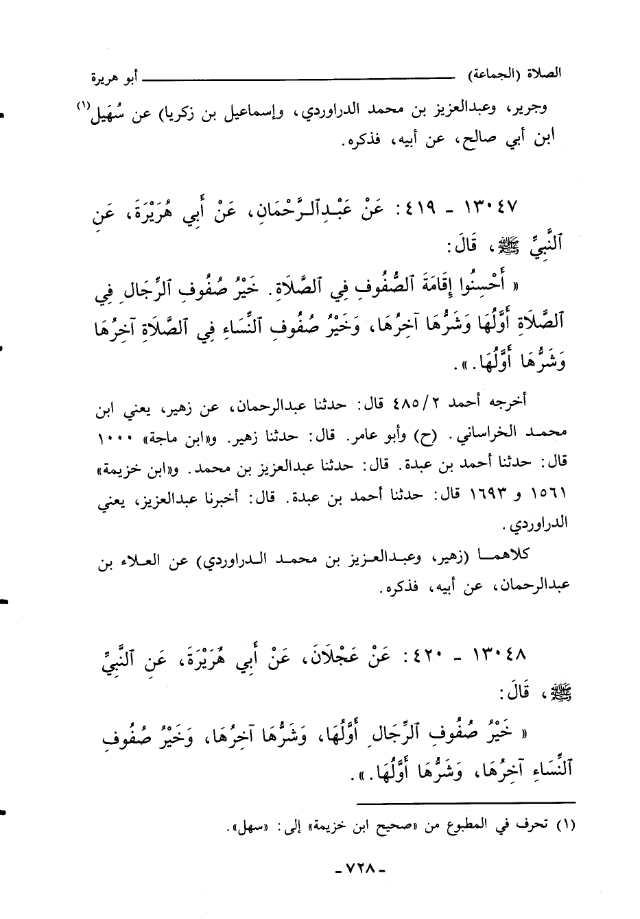 (أَحْسِنُوا إِقَامَةَ الصُّفُوفِ فِي الصَّلَاةِ، خَيْرُ صُفُوفِ الرِّجَالِ فِي الصَّلَاةِ أَوَّلُهَا، وَشَرُّهَا آخِرُهَا، وَخَيْرُ صُفُوفِ النِّسَاءِ فِي الصَّلَاةِ آخِرُهَا، وَشَرُّهَا أَوَّلُهَا.) ".