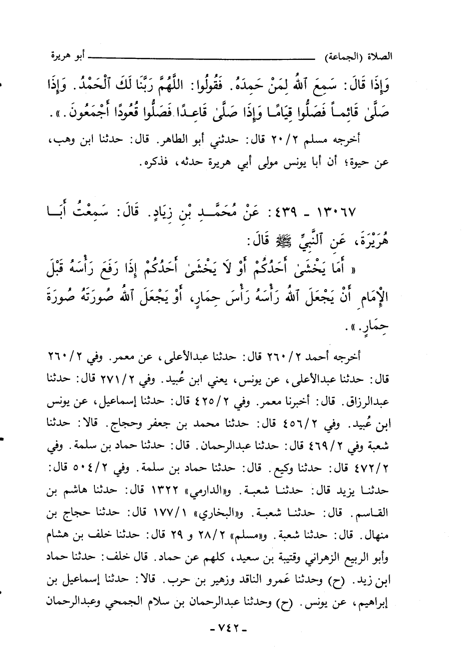 - وفي رواية: " (مَا يَأْمَنُ الَّذِي يَرْفَعُ رَأْسَهُ فِي صَلَاتِهِ قَبْلَ الإِمَامِ، أَنْ يُحَوِّلَ اللَّهُ صُورَتَهُ صُورَةَ حِمَارٍ.) ".
