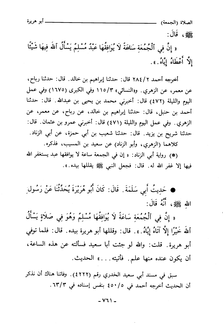 (إِنَّ فِي الْجُمُعَةِ سَاعَةً لَا يُوَافِقُهَا مُسْلِمٌ وَهُوَ فِي صَلَاةٍ، يَسْأَلُ اللهَ خَيْرًا، إِلَاّ آتَاهُ إِيَّاهُ.) ".