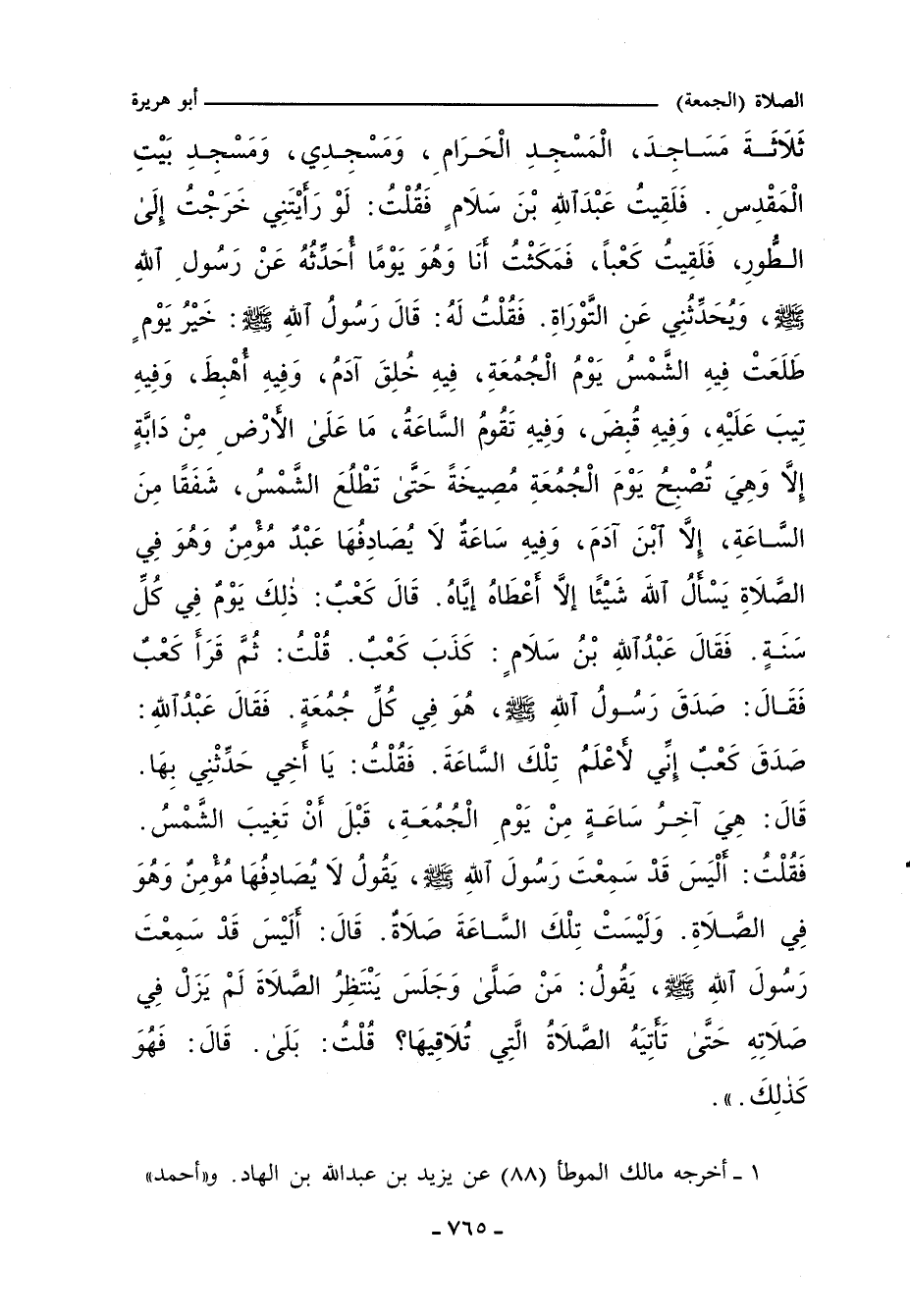 الْجُمُعَةِ، فَقُلْتُ: قَالَ كَعْبٌ: ذَلِكَ فِي كُلِّ سَنَةٍ يَوْمٌ، قَالَ: قَالَ عَبْدُ اللهِ بْنُ سَلَامٍ: كَذَبَ كَعْبٌ، فَقُلْتُ: ثُمَّ قَرَأَ كَعْبٌ التَّوْرَاةَ، فَقَالَ: بَلْ هِيَ فِي كُلِّ جُمُعَةٍ، فَقَالَ عَبْدُ اللهِ بْنُ سَلَامٍ: صَدَقَ كَعْبٌ، ثُمَّ قَالَ عَبْدُ اللهِ بْنُ سَلَامٍ: قَدْ عَلِمْتُ أَيَّةَ سَاعَةٍ هِيَ، قَالَ أَبُو هُرَيْرَةَ: فَقُلْتُ لَهُ: أَخْبِرْنِي بِهَا وَلَا تَضَنَّ عَلَيَّ، فَقَالَ عَبْدُ اللهِ بْنُ سَلَامٍ: هِيَ آخِرُ سَاعَةٍ فِي يَوْمِ الْجُمُعَةِ، قَالَ أَبُو هُرَيْرَةَ: فَقُلْتُ: وَكَيْفَ تَكُونُ آخِرُ سَاعَةٍ فِي يَوْمِ الْجُمُعَةِ، وَقَدْ قَالَ رَسُولُ اللهِ صلى الله عليه وسلم: لَا يُصَادِفُهَا عَبْدٌ مُسْلِمٌ وَهُوَ يُصَلِّي، وَتِلْكَ السَّاعَةُ سَاعَةٌ لَا يُصَلَّي فِيهَا، فَقَالَ عَبْدُ اللهِ بْنُ سَلَامٍ: أَلَمْ يَقُلْ رَسُولُ اللهِ صلى الله عليه وسلم: مَنْ جَلَسَ مَجْلِسًا يَنْتَظِرُ الصَّلَاةَ فَهُوَ فِي صَلَاةٍ حَتَّى يُصَلِّيَ، قَالَ أَبُو هُرَيْرَةَ: فَقُلْتُ: بَلَى، قَالَ: فَهُوَ ذَلِكَ.) ".