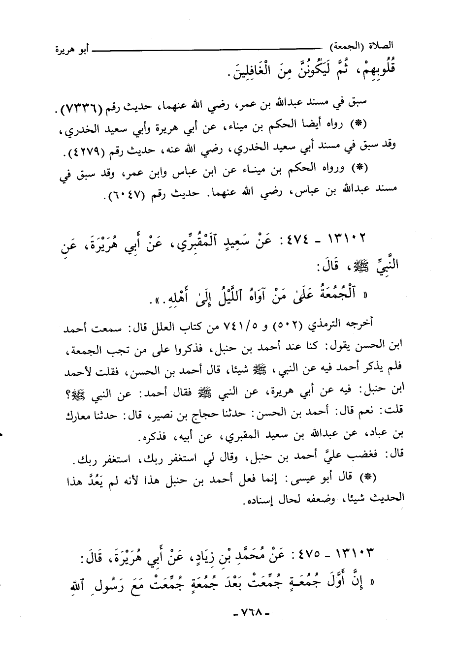 أخرجه الترمذي (٥٠٢) و ٥/ ٧٤١ من كتاب ((العلل))]] قال: سمعت أحمد بن الحسن يقول: كنا عند أحمد بن حنبل، فذكروا على مَنْ تَجِبُ الجمعة، فلم يذكر أحمد فيه عن النَّبِيِّ صلى الله عليه وسلم شيئًا، قال أحمد بن الحسن، فقلت لأحمد بن حنبل: فيه عن أبي هريرة، عن النَّبِيِّ صلى الله عليه وسلم، فقال أحمد: عن النَّبِيِّ صلى الله عليه وسلم؟ قلت: نعم، قال أحمد بن الحسن: حدَّثنا حجاج بن نُصَيْر، حدَّثنا معارك بن عباد، عن عبد الله بن سعيد المقبري، عن أبيه، فذكره.