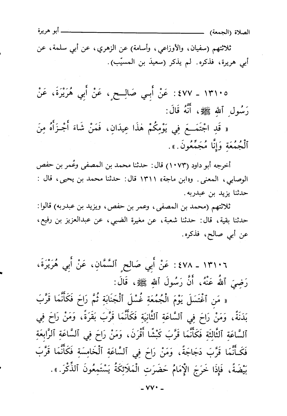 - لفظ سهيل: " (أَنَّ رَسُولَ اللهِ صلى الله عليه وسلم قَالَ: عَلَى كُلِّ بَابٍ مِنْ أَبْوَابِ الْمَسْجِدِ مَلَكٌ، يَكْتُبُ الأَوَّلَ فَالأَوَّلَ - مَثَّلَ الْجَزُورَ، ثُمَّ نَزَّلَهُمْ حَتَّى صَغَّرَ إِلَى مَثَلِ الْبَيْضَةِ - فَإِذَا جَلَسَ الإِمَامُ طُوِيَتِ الصُّحُفُ وَحَضَرُوا الذِّكْرَ.) ".
