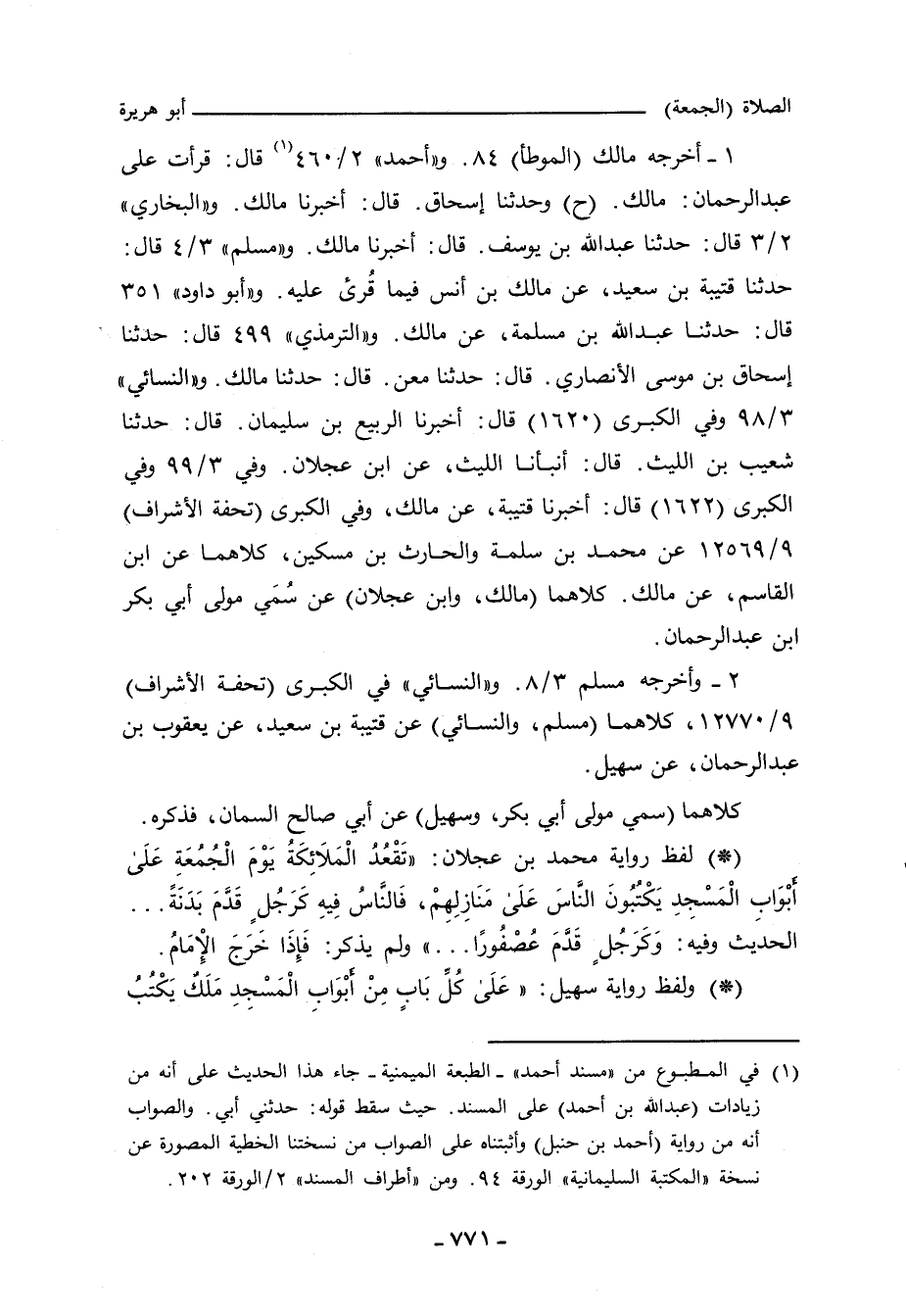١ - أخرجه مالك ((الموطأ))]] ٨٤. وعبد الرَّزَّاق (٥٥٦٥) عن ابن جريج. و ((أحمد))]] ٢/ ٤٦٠ (٩٩٢٨) قال: قرأت على عبد الرحمن: مالك (ح) وحدَّثنا إسحاق، قال: أَخْبَرنا مالك. و ((البُخاري))]] ٨٨١ قال: حدَّثنا عبد الله بن يوسف، قال: أَخْبَرنا مالك. و ((مسلم))]] ١٩١٧ قال: حدَّثنا قتيبة بن سعيد، عن مالك بن أنس فيما قُرئ عليه. و ((أبو داود))]] ٣٥١ قال: حدَّثنا عبد الله بن مسلمة، عن مالك. و ((التِّرمِذي))]] ٤٩٩ قال: حدَّثنا إسحاق بن موسى الأنصاري، حدَّثنا معن، حدَّثنا مالك. و ((النَّسائي))]] ٣/ ٩٨، وفي ((الكبرى))]] ١٧٠٦ و ١١٩١٠ قال: أَخْبَرنا الربيع بن سليمان، قال: حدَّثنا شعيب بن الليث، قال: أنبأنا الليث، عن ابن عجلان. وفي ٣/ ٩٩، وفي ((الكبرى))]] ١٧٠٨ قال: أَخْبَرنا قتيبة، عن مالك. وفي ((الكبرى))]] ١١٩٠٩ عن محمد بن سلمة، والحارث بن مسكين، كلاهما عن ابن القاسم، عن مالك. و ((ابن حِبَّان))]] ٢٧٧٥ قال: أَخْبَرنا عمر بن سعيد بن سنان، بمنبج، أَخْبَرنا أحمد بن أبي بكر، عن مالك. ثلاثتهم (مالك، وابن جريج، وابن عجلان) عن سُمَي، مولى أبي بكر بن عبد الرحمن.