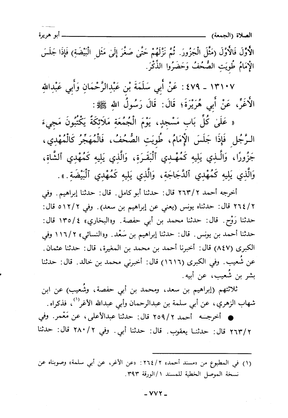 (عَلَى كُلِّ بَابِ مَسْجِدٍ يَوْمَ الْجُمُعَةِ مَلَائِكَةٌ يَكْتُبُونَ مَجِيءَ الرَّجُلِ، فَإِذَا جَلَسَ الإِمَامُ طُوِيَتِ الصُّحُفُ، فَالْمُهَجِّرُ كَالْمُهْدِى جَزُورًا، وَالَّذِي يَلِيهِ كَمُهْدِي الْبَقَرَةِ، وَالَّذِي يَلِيهِ كَمُهْدِي الشَّاةِ، وَالَّذِي يَلِيهِ كَمُهْدِي الدَّجَاجَةِ، وَالَّذِى يَلِيهِ كَمُهْدِي الْبَيْضَةِ.) ".