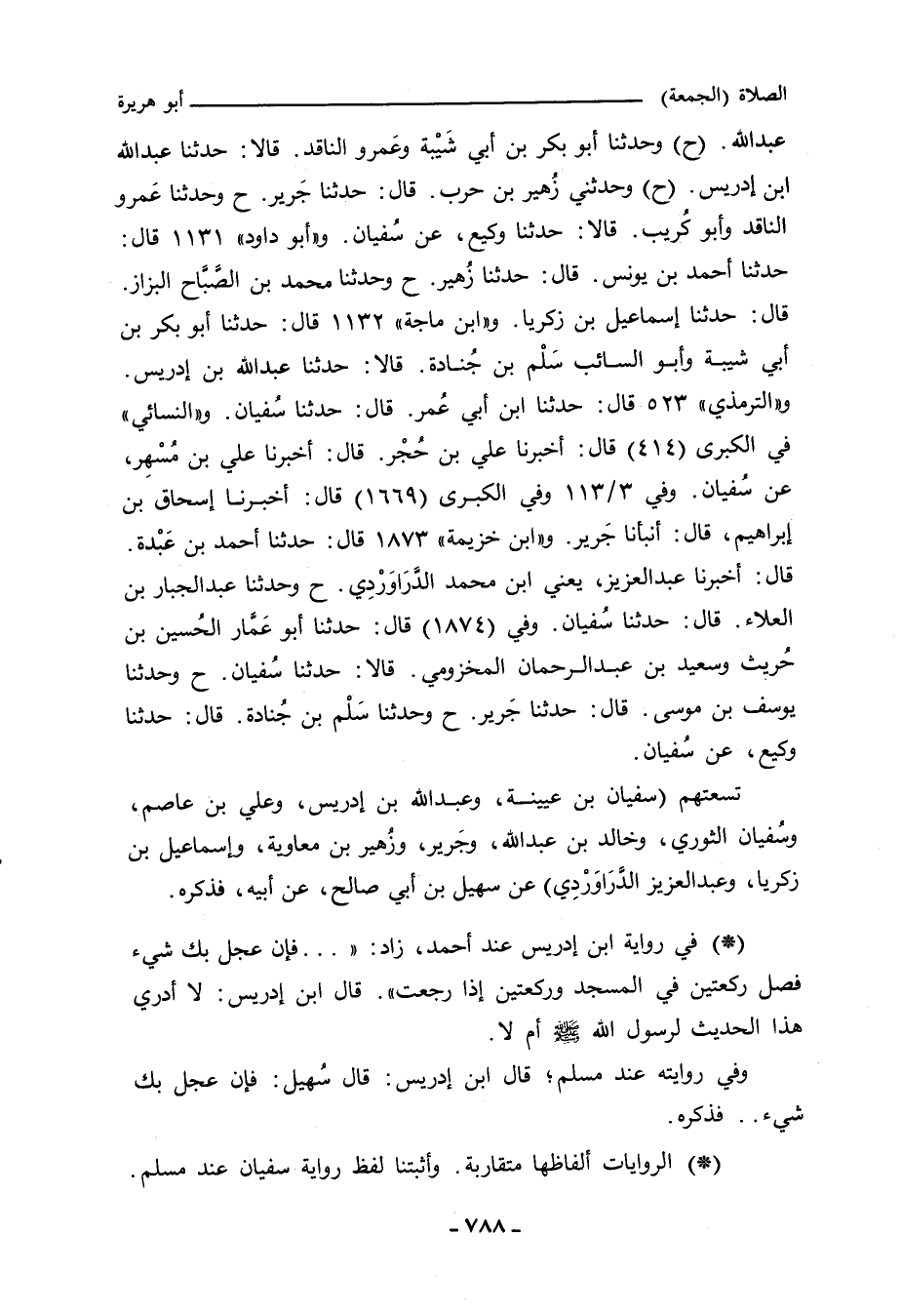 عبد الله. وفي (١٩٩٢) قال: وحدَّثنا أبو بكر بن أبي شَيْبة، وعَمرو الناقد، قالا: حدَّثنا عبد الله بن إدريس. وفي (١٩٩٣) قال: وحدثني زُهير بن حرب، حدَّثنا جَرير (ح) وحدَّثنا عَمرو الناقد، وأبو كُريب، قالا: حدَّثنا وكيع، عن سُفيان. و ((أبو داود))]] ١١٣١ قال: حدَّثنا أحمد بن يونس، حدَّثنا زُهير (ح) وحدَّثنا محمد بن الصَّبَّاح البزاز، حدَّثنا إسماعيل بن زكريا. و ((ابن ماجة))]] ١١٣٢ قال: حدَّثنا أبو بكر بن أبي شيبة، وأبو السائب، سَلْم بن جُنادة، قالا: حدَّثنا عبد الله بن إدريس. و ((التِّرمِذي))]] ٥٢٣ قال: حدَّثنا ابن أبي عُمر، حدَّثنا سُفيان. و ((النَّسائي))]] في ((الكبرى))]] ٥٠١ قال: أَخْبَرنا علي بن حُجْر، قال: أَخْبَرنا علي بن مُسْهِر، عن سُفيان. وفي ٣/ ١١٣، وفي ((الكبرى))]] ١٧٥٥ قال: أَخْبَرنا إسحاق بن إبراهيم، قال: أنبأنا جَرير. و ((ابن خزيمة))]] ١٨٧٣ قال: حدَّثنا أحمد بن عَبْدة، أَخْبَرنا عبد العزيز، يعني ابن محمد الدرَاوَرْدِي (ح) وحدَّثنا عبد الجبار بن العلاء، حدَّثنا سُفيان. وفي (١٨٧٤) قال: حدَّثنا أبو عَمَّار، الحُسين بن حُريث، وسعيد بن عبد الرحمن المخزومي، قالا: حدَّثنا سُفيان (ح) وحدَّثنا يوسف