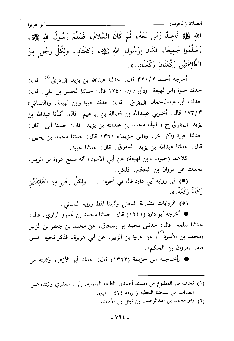 (خَرَجْنَا مَعَ رَسُولِ اللهِ صلى الله عليه وسلم إِلَى نَجْدٍ، حَتَّى إِذَا كُنَّا بِذَاتِ الرِّقَاعِ، مِنْ نَخْلٍ، لَقِيَ جَمْعًا مِنْ غَطَفَانَ .... ))]]. فَذَكَرَ مَعْنَاهُ، وَلَفْظُهُ عَلَى غَيْرِ لَفْظِ حَيْوَةَ، وَقَالَ فِيهِ: حِينَ رَكَعَ بِمَنْ مَعَهُ وَسَجَدَ، قَالَ: فَلَمَّا قَامُوا مَشَوُا الْقَهْقَرَى إِلَى مَصَافِّ أَصْحَابِهِمْ، وَلَمْ يَذْكُرِ اسْتِدْبَارَ الْقِبْلَةِ.