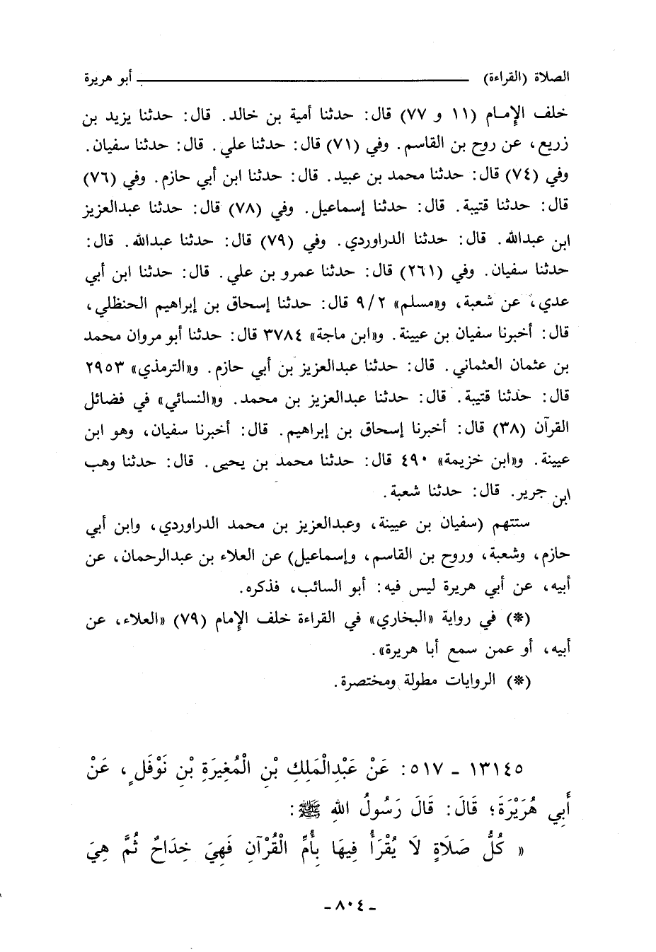 - في رواية ((البخاري))]] في القراءة خلف الإمام (٧٩) ((العلاء، عن أو عمن سمع أبا هريرة))]]. توضع هذه الرواية دائرة