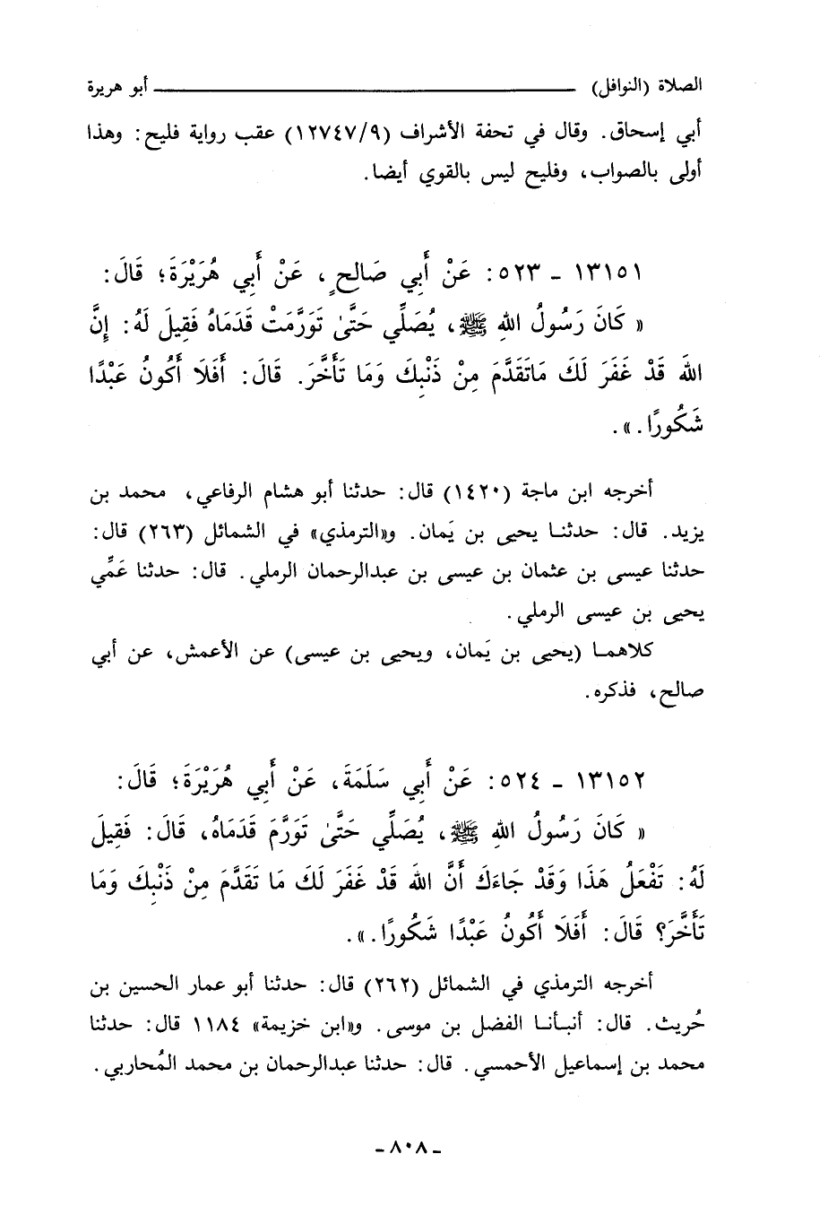 (كَانَ النَّبِيُّ صلى الله عليه وسلم يُصَلِّى حَتَّى تَوَرَّمَ قَدَمَاهُ، فَقَالُوا: يَا رَسُولَ اللهِ، تَفْعَلْ هَذَا وَقَدْ تَوَرَّمَ قَدَمَاكَ، وَاللهُ تَعَالَى قَدْ غَفَرَ لَكَ لَكَ مَا تَقَدَّمَ مِنْ ذَنْبِكَ وَمَا تَأَخَّرَ، قَالَ: أَفَلَا أَكُونُ عَبْدًا شَكُورًا.) ".
