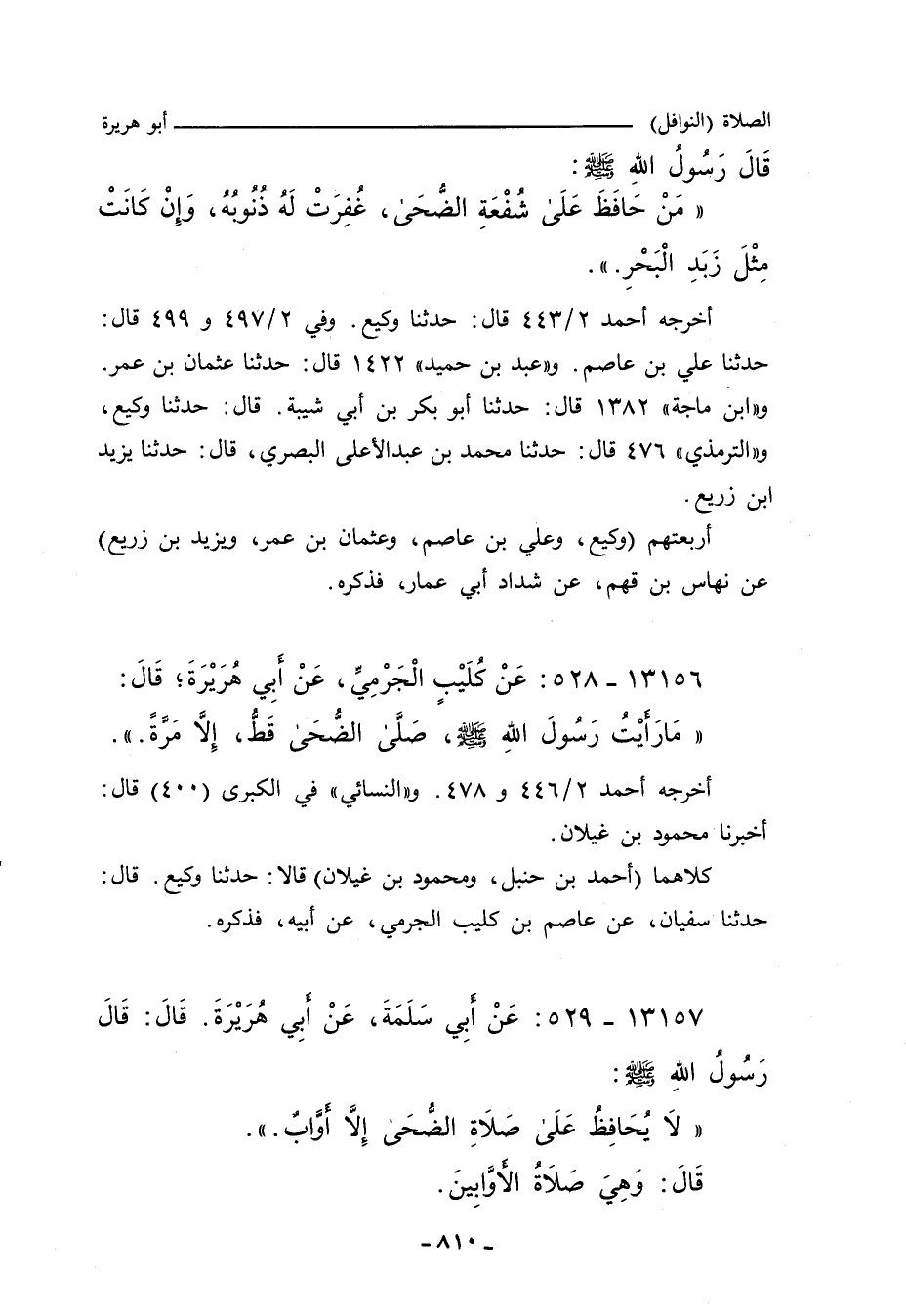 - في رواية عثمان بن عمر: " (مَنْ حَافَظَ عَلَى سُبْحَةِ الضُّحَى .... ) ".