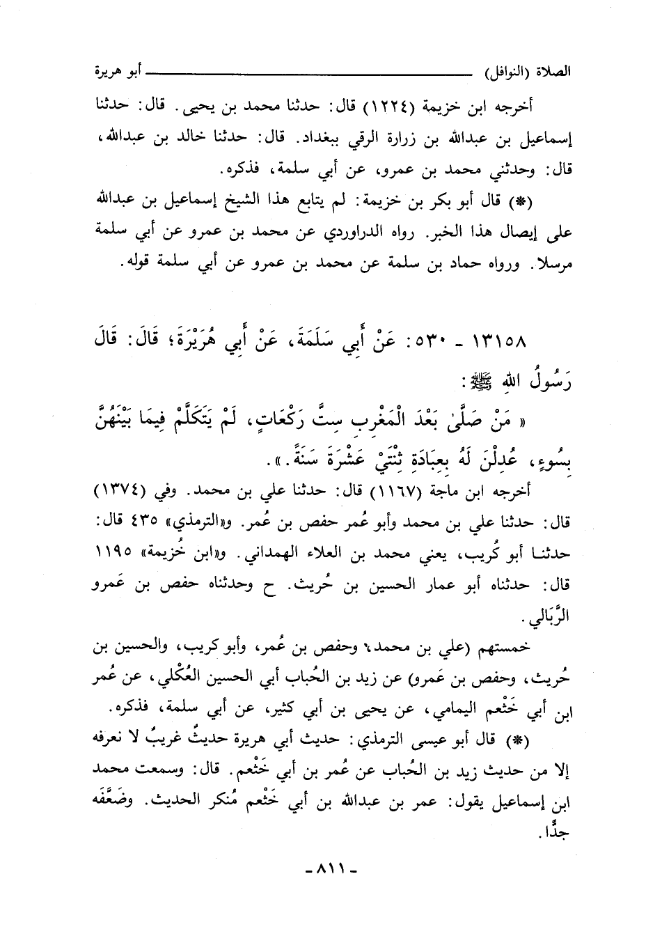 - وفي رواية: " (مَنْ صَلَّى سِتَّ رَكَعَاتٍ بَعْدَ الْمَغْرِبِ، لَا يَتَكَلَّمْ بَيْنَهُنَّ بِشَيْءٍ إِلَاّ بِذِكْرِ اللهِ، عُدِلْنَ لَهُ بِعِبَادَةِ اثْنَيْ عَشْرَةَ سَنَةً.) ".