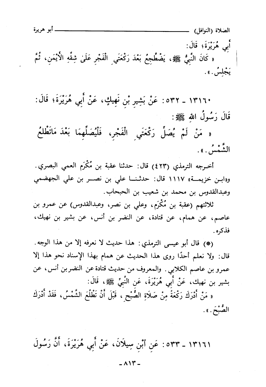 - وفي رواية: " (مَنْ نَسِيَ رَكْعَتَيِ الْفَجْرِ، فَلْيُصَلِّهِمَا إِذَا طَلَعَتِ الشَّمْسُ.) ".