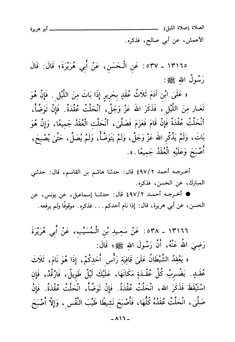 (عَلَى ابْنِ آدَمَ ثَلَاثُ عُقَدٍ بِجَرِيرٍ إِذَا بَاتَ مِنَ اللَّيْلِ، فَإِنْ هُوَ تَعَارَّ مِنَ اللَّيْلِ فَذَكَرَ اللهَ، عَزَّ وَجَلَّ، انْحَلَّتْ عُقْدَةٌ، فَإِنْ تَوَضَّأَ انْحَلَّتْ عُقْدَةٌ، فَإِنْ قَامَ فَعَزَمَ فَصَلَّى انْحَلَّتِ الْعُقَدُ جَمِيعًا، وَإِنْ هُوَ بَاتَ وَلَمْ يَذْكُرِ اللهَ، عَزَّ وَجَلَّ، وَلَمْ يَتَوَضَّأْ، وَلَمْ يُصَلِّ، حَتَّى يُصْبِحَ، أَصْبَحَ وَعَلَيْهِ الْعُقَدُ جَمِيعًا.) ".