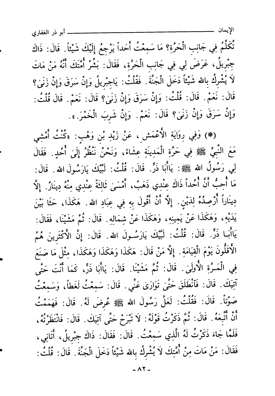 - وفي رواية: كُنْتُ أَمْشِي مَعَ النَّبِيِّ صلى الله عليه وسلم فِي حَرَّةِ الْمَدِينَةِ عِشَاءً، وَنَحْنُ نَنْظُرُ إِلَى أُحُدٍ، فَقَالَ لِي رَسُولُ اللهِ صلى الله عليه وسلم: يَا أَبَا ذَرٍّ، قَالَ: قُلْتُ: لَبَّيْكَ يَا رَسُولَ اللهِ، قَالَ: مَا أُحِبُّ أَنَّ أُحُدًا ذَاكَ عِنْدِي ذَهَبٌ، أَمْسَى ثَالِثَةً عِنْدِي مِنْهُ دِينَارٌ، إِلَاّ دِينَارًا أُرْصِدُهُ لِدَيْنٍ، إِلَاّ أَنْ أَقُولَ بِهِ فِي عِبَادِ اللهِ هَكَذَا، حَثَا بَيْنَ يَدَيْهِ، وَهَكَذَا عَنْ يَمِينِهِ، وَهَكَذَا عَنْ شِمَالِهِ، قَالَ: ثُمَّ مَشَيْنَا، فَقَالَ: يَا أَبَا ذَرٍّ، قَالَ: قُلْتُ: لَبَّيْكَ يَا رَسُولَ اللهِ، قَالَ: إِنَّ الأَكْثَرِينَ هُمُ الأَقَلُّونَ يَوْمَ الْقِيَامَةِ، إِلَاّ مَنْ قَالَ: هَكَذَا وَهَكَذَا وَهَكَذَا، مِثْلَ مَا صَنَعَ فِي الْمَرَّةِ الأُولَى، قَالَ: ثُمَّ مَشَيْنَا، قَالَ: يَا أَبَا ذَرٍّ، كَمَا أَنْتَ حَتَّى آتِيَكَ، قَالَ: فَانْطَلَقَ حَتَّى تَوَارَى عَنِّي، قَالَ: سَمِعْتُ لَغَطًا، وَسَمِعْتُ صَوْتًا، قَالَ: فَقُلْتُ: لَعَلَّ رَسُولَ اللهِ صلى الله عليه وسلم عُرِضَ لَهُ، قَالَ: فَهَمَمْتُ أَنْ أَتَّبِعَهُ، قَالَ: ثُمَّ ذَكَرْتُ قَوْلَهُ: لَا تَبْرَحْ حَتَّى آتِيَكَ، قَالَ: فَانْتَظَرْتُهُ، فَلَمَّا جَاءَ ذَكَرْتُ لَهُ الَّذِي سَمِعْتُ، قَالَ: فَقَالَ: ذَاكَ جِبْرِيلُ، أَتَانِي، فَقَالَ: مَنْ مَاتَ مِنْ أُمَّتِكَ لَا يُشْرِكُ بِاللهِ شَيْئًا دَخَلَ الْجَنَّةَ، قَالَ: قُلْتُ: