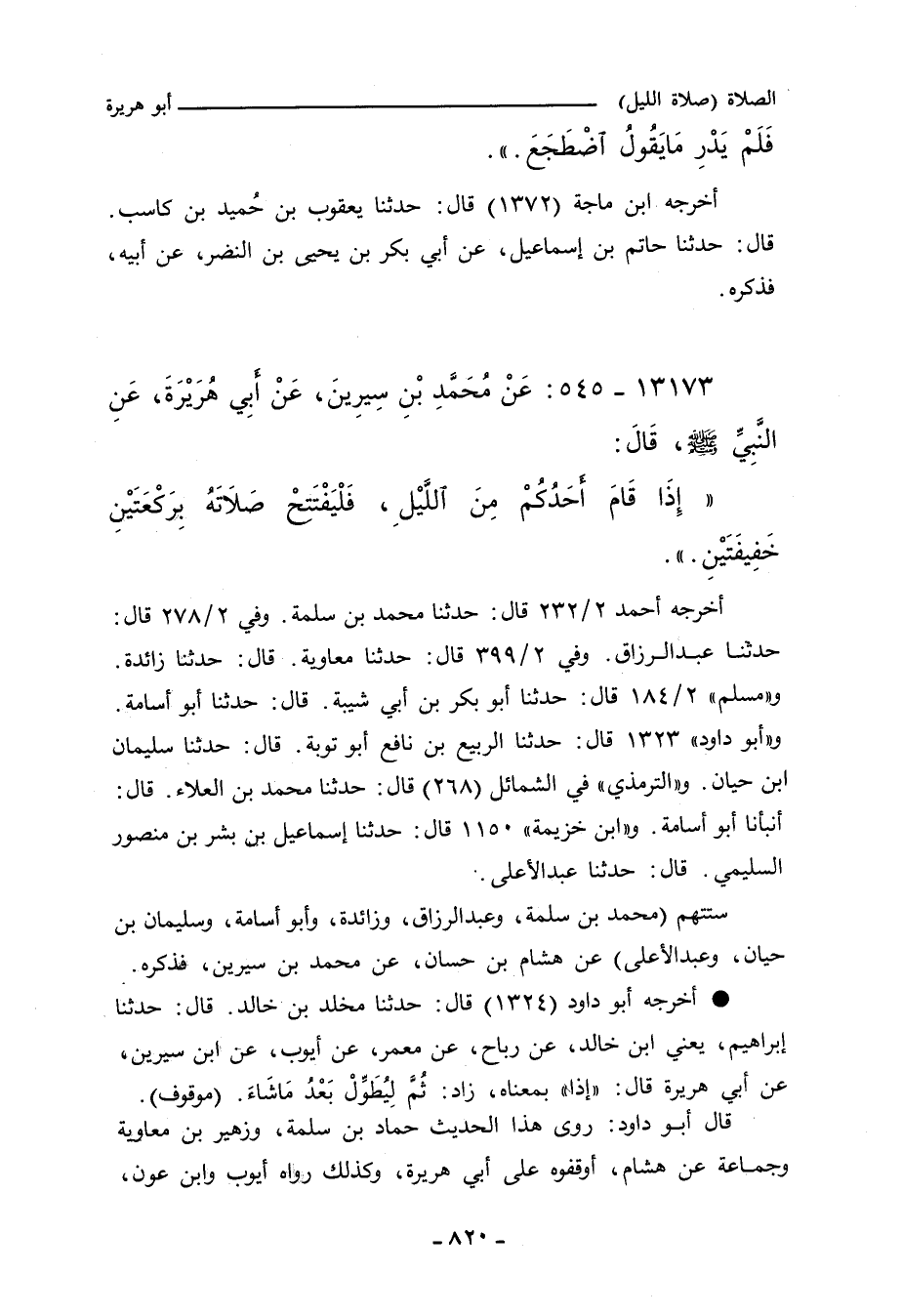 - وفي ٢/ ٢٧٣ (٦٦٢٢) قال: حدَّثنا أبو أسامة، عن هشام، عن محمد، قال: مَا رَأَيْتُهُ افْتَتَحَ صَلَاةَ تَطَوُّعٍ إِلَاّ بِرَكْعَتَيْنِ خَفِيفَتَيْنِ.