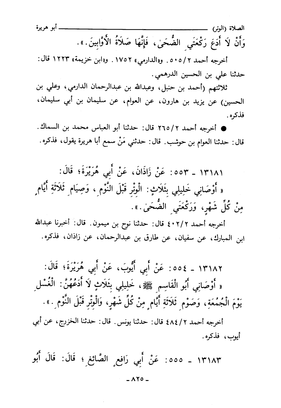 (أَوْصَانِي خَلِيلِي بِثَلَاثٍ: الْوِتْرِ قَبْلَ النَّوْمِ، وَصِيَامِ ثَلَاثَةِ أَيَّامٍ مِنْ كُلِّ شَهْرٍ، وَرَكْعَتَيِ الضُّحَى.) ".