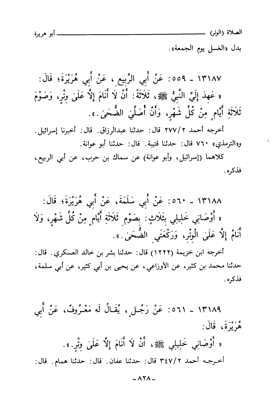 (عَهِدَ إِلَيَّ رَسُولُ اللهِ صلى الله عليه وسلم فِي ثَلَاثٍ لَا أَدَعُهُنَّ أَبَدًا: لَا أَنَامُ إِلَاّ عَلَى وِتْرٍ، وَصَلَاةِ الضُّحَى، وَصِيَامِ ثَلَاثَةِ أَيَّامٍ مِنْ كُلِّ شَهْرٍ.) ".