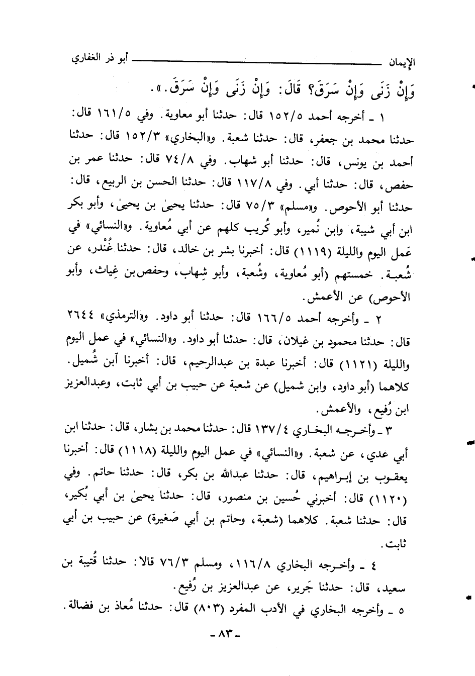- وفي رواية: انَطْلَقَ النَّبِيُّ صلى الله عليه وسلم نَحْوَ بَقِيعِ الْغَرْقَدِ، فَانْطَلَقْتُ خَلْفَهُ، فَقَالَ: يَا أَبَا ذَرٍّ، فَقُلْتُ: لَبَّيْكَ ثُمَّ سَعْدَيْكَ وَأَنَا فِدَاؤُكَ، فَقَالَ: الْمُكْثِرُونَ هُمُ الْمُقِلُّونَ يَوْمَ الْقِيَامَةِ، إِلَاّ مَنْ قَالَ بِالْمَالِ هَكَذَا وَهَكَذَا، عَنْ يَمِينِهِ وَعَنْ شِمَالِهِ، قَالَهَا ثَلَاثًا، ثُمَّ عَرَضَ لَنَا أُحُدٌ، فَقَالَ: يَا أَبَا ذَرٍّ، مَا يَسُرُّنِي أَنَّهُ لآلِ مُحَمَّدٍ ذَهَبًا يُمْسِي مَعَهُمْ دِينَارٌ، أَوْ مِثْقَالٌ، فَقُلْتُ: اللَّهُ وَرَسُولُهُ أَعْلَمُ، ثُمَّ عَرَضَ لَنَا وَادٍ فَاسْتَبْطَنَهُ النَّبِيُّ صلى الله عليه وسلم وَنَزَلَ فِيهِ، وَجَلَسْتُ عَلَى شَفِيرِهِ، فَظَنَنْتُ أَنَّ لَهُ حَاجَةً، فَأَبْطَأَ عَلَيَّ وَسَاءَ ظَنِّي، فَسَمِعْتُ مُنَاجَاةً، فَقَالَ: ذَلِكَ جِبْرِيلُ يُخْبِرُنِي لأُمَّتِي مَنْ شَهِدَ مِنْهُمْ أَنْ لَا إِلَهَ إِلَاّ اللَّهُ، وَأَنَّ مُحَمَّدًا رَسُولُ اللهِ، دَخَلَ الْجَنَّةَ، فَقُلْتُ: يَا رَسُولَ اللهِ، وَإِنْ زَنَى وَإِنْ سَرَقَ؟ قَالَ: وَإِنْ زَنَى وَإِنْ سَرَقَ. "
