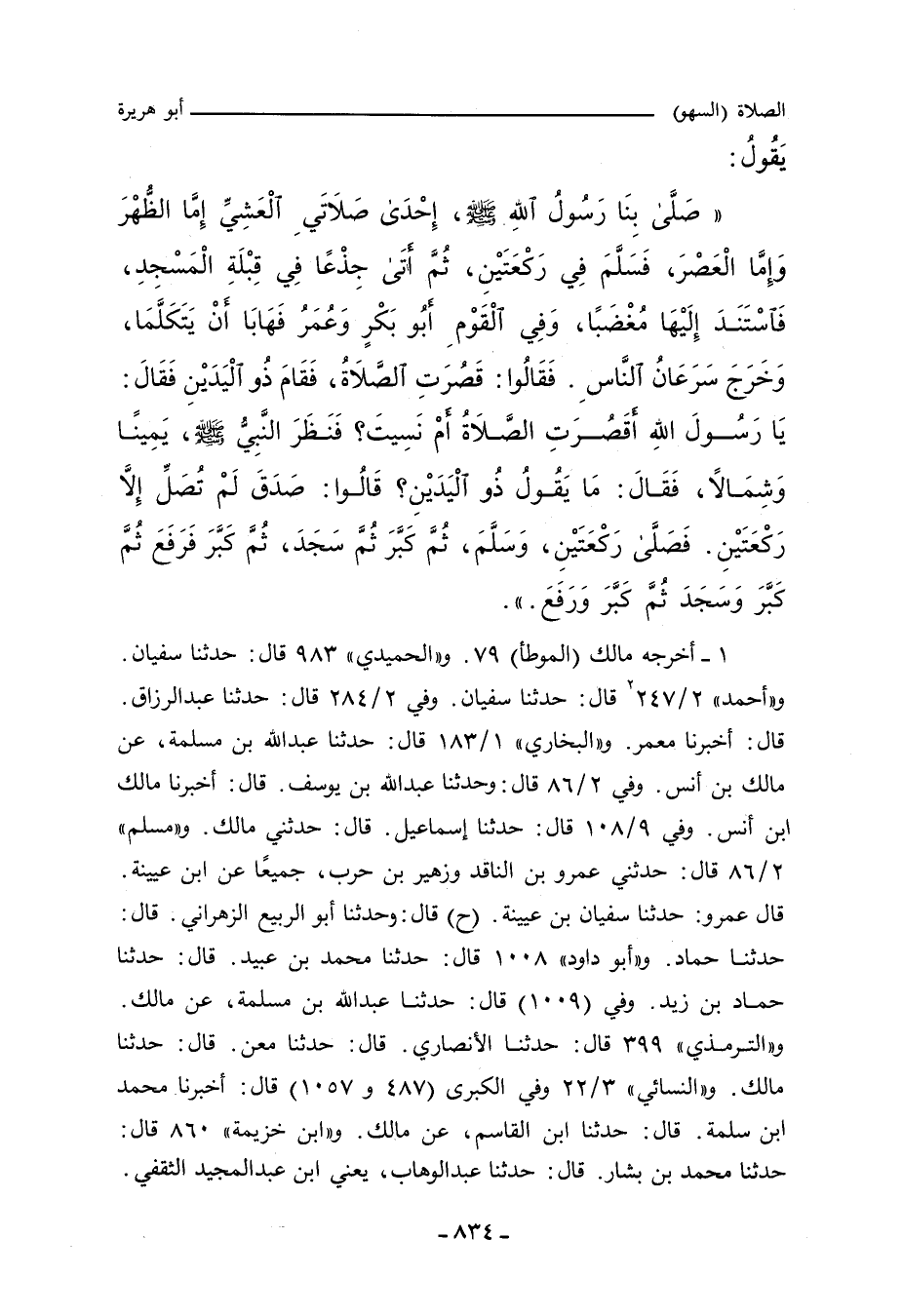 - وفي رواية: " (صَلَّى بِنَا رَسُولُ اللهِ صلى الله عليه وسلم إِحْدَى صَلَاتَيِ الْعَشِيِّ رَكْعَتَيْنِ، ثُمَّ سَلَّمَ، ثُمَّ قَامَ إِلَى خَشَبَةٍ كَانَتْ فِي الْمَسْجِدِ يَسْتَنِدُ إِلَيْهَا، فَخَرَجَ سَرَعَانُ النَّاسِ يَقُولُونَ: قَصُرَتِ الصَّلَاةُ، وَفِي الْقَوْمِ أَبُو بَكْرٍ، وَعُمَرُ، فَهَابَاهُ أَنْ يَقُولَا لَهُ شَيْئًا، وَفِي الْقَوْمِ رَجُلٌ طَوِيلُ الْيَدَيْنِ يُسَمَّى ذَا الْيَدَيْنِ، فَقَالَ: يَا رَسُولَ اللهِ، أَقَصُرَتِ الصَّلَاةُ أَمْ نَسِيتَ؟ فَقَالَ: لَمْ تَقْصُرْ وَلَمْ أَنْسَ، قَالَ: فَإِنَّمَا صَلَّيْتَ رَكْعَتَيْنِ، فَقَالَ: أَكَمَا يَقُولُ ذُو الْيَدَيْنِ؟ قَالُوا: نَعَمْ، قَالَ: فَقَامَ فَصَلَّى رَكْعَتَيْنِ، ثُمَّ سَلَّمَ، ثُمَّ سَجَدَ سَجْدَتَيْنِ، ثُمَّ سَلَّمَ.) ".