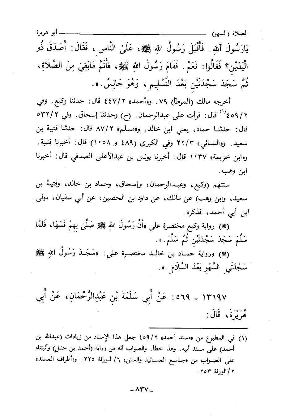 يَا رَسُولَ اللهِ، فَأَقْبَلَ رَسُولُ اللهِ صلى الله عليه وسلم عَلَى النَّاسِ، فَقَالَ: أَصَدَقَ ذُو الْيَدَيْنِ؟ فَقَالُوا: نَعَمْ، فَقَامَ رَسُولُ اللهِ صلى الله عليه وسلم فَأَتَمَّ مَا بَقِيَ مِنَ الصَّلَاةِ، ثُمَّ سَجَدَ سَجْدَتَيْنِ بَعْدَ التَّسْلِيمِ، وَهُوَ جَالِسٌ.) ".