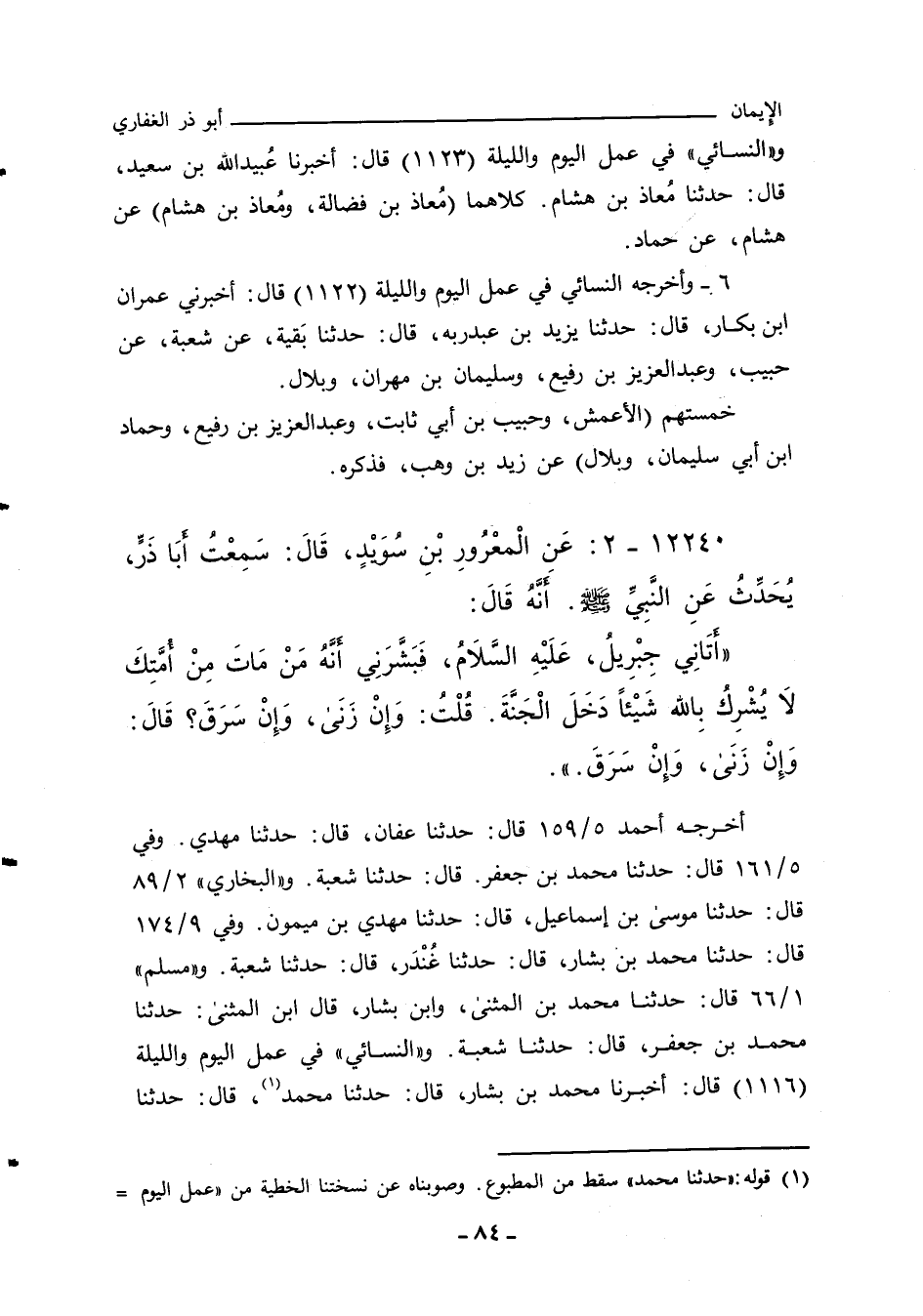 خالد، قال: حدَّثنا غُنْدر، عن شُعبة، عن سليمان. وفي (١٠٨٩٣) قال: أخبرني حُسين بن منصور، قال: حدَّثنا يحيى بن أبي بُكير، قال: حدَّثنا شعبة، عن حبيب بن أبي ثابت. وفي (١٠٨٩٤) قال: أَخْبَرنا عبدة بن عبد الرحيم، قال: أَخْبَرنا ابن شُميل قال: أَخْبَرنا شعبة، قال: حدَّثنا حبيب بن أبي ثابت، وسليمان الأعمش، وعبد العزيز بن رُفيع. وفي (١٠٨٩٥) قال: أخبرني عمران بن بكار، قال: حدَّثنا يزيد بن عبد ربه، قال: حدَّثنا بَقية، عن شعبة، عن حبيب، وعن عبد العزيز بن رفيع، وسليمان بن مهران، وبلال. وفي (١٠٨٩٦) قال: أَخْبَرنا عُبيد الله بن سعيد، قال: حدَّثنا مُعاذ بن هشام، قال: حدَّثني أبي، عن حماد. و"ابن حِبان" ١٦٩ قال: أَخْبَرنا أحمد بن يحيى بن زهير، حدثنا إبراهيم بن بسطام، حدثنا أبو داود، حدثنا شعبة، عن الأعمش، وحبيب بن أبي ثابت، وعبد العزيز بن رفيع. وفي (١٧٠) قال: أَخْبَرنا الحسين بن عبد الله بن يزيد القطان، بالرقة، حدثنا هشام بن عمار، حدثنا عيسى بن يونس، عن الأعمش. وفي (١٩٥) قال: أَخْبَرنا أبو خليفة، حدثنا مسلم بن إبراهيم، عن هشام بن أبي عبد الله، حدثنا حماد بن أبي سليمان. وفي (٢١٣) قال: أَخْبَرنا محمد بن الحسن بن مكرم البزار، بالبصرة، حدثنا خلاد بن أسلم، حدثنا النضر بن شميل، حدثنا شعبة، عن حبيب بن أبي ثابت، وسليمان، وعبد العزيز بن رفيع. وفي (٣٣٢٦) قال: أَخْبَرنا عبد الله بن محمد الأزدي، قال: حدَّثنا إسحاق بن إبراهيم، قال: أَخْبَرنا جرير، وعيسى بن يونس، قالا: حدثنا الأعمش.
