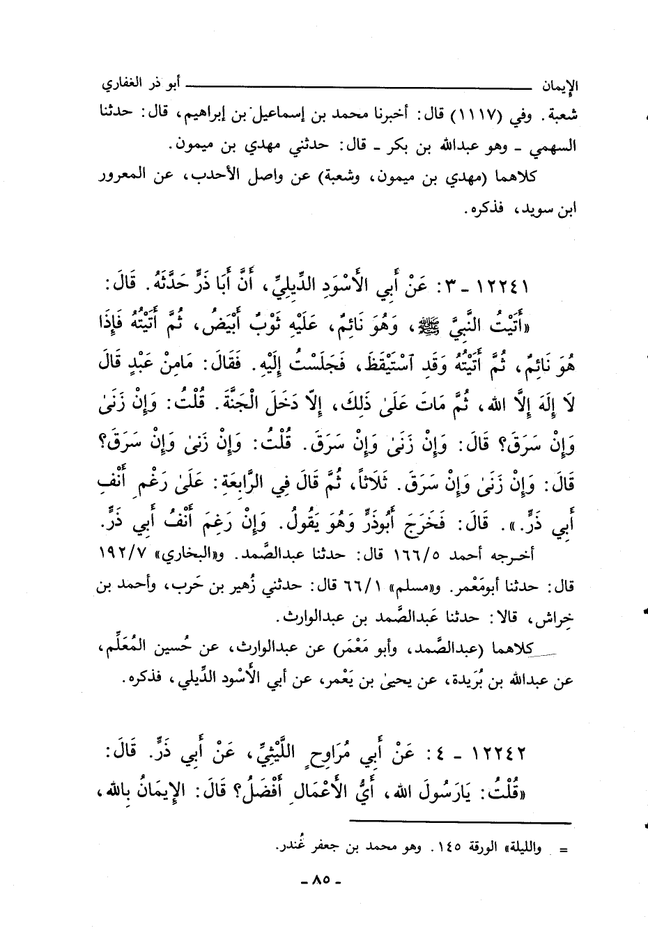 أخرجه أحمد ٥/ ١٦٦ (٢١٧٩٨) قال: حدَّثنا عبد الصمد. و"البُخاري" ٧/ ١٩٢ (٥٨٢٧) قال: حدَّثنا أبو مَعْمر. و"مسلم" ١/ ٦٦ قال: حدثني زُهير بن حَرب، وأحمد بن خِراش، قالا: حدَّثنا عبد الصمد بن عبد الوارث.
