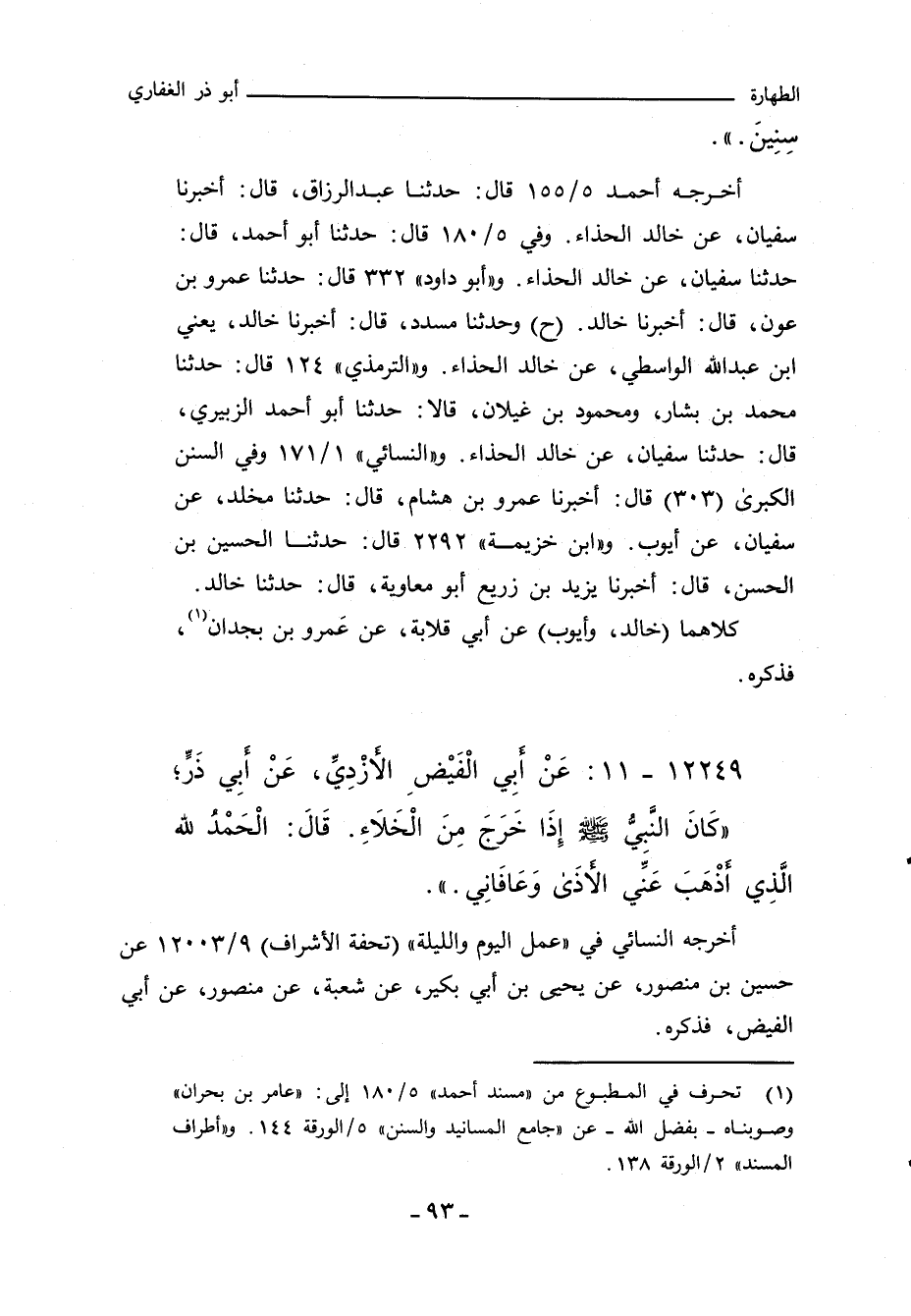 أخرجه عبد الرَّزَّاق (٩١٣) عن الثوري، عن خالد الحذاء. و"أحمد" ٥/ ١٥٥ (٢١٦٩٨) قال: حدَّثنا عبد الرَّزَّاق، أنبأنا سفيان، عن خالد الحذاء. وفي ٥/ ١٨٠ (٢١٩٠١) قال: حدَّثنا أبو أحمد، حدَّثنا سفيان، عن خالد الحذاء. و"أبو داود" ٣٣٢ قال: حدَّثنا عمرو بن عون، أَخْبَرنا خالد. (ح) وحدثنا مسدد، أَخْبَرنا خالد، يعني ابن عبد الله الواسطي، عن خالد الحذاء. و"التِّرمِذي" ١٢٤ قال: حدَّثنا محمد بن بشار، ومحمود بن غيلان، قالا: حدَّثنا أبو أحمد الزبيري، حدَّثنا سفيان، عن خالد الحذاء. و"النَّسائي" ١/ ١٧١، وفي "الكبرى" ٣٠٧ قال: أَخْبَرنا عمرو بن هشام، قال: حدَّثنا مخلد، عن سفيان، عن أيوب. و"ابن خزيمة" ٢٢٩٢ قال: حدَّثنا الحسين بن الحسن، أَخْبَرنا يزيد بن زريع، أبو معاوية، حدَّثنا خالد. و"ابن حِبان" ١٣١١ قال: أَخْبَرنا شباب بن صالح، قال: حدَّثنا وهب بن بقية، قال: أَخْبَرنا خالد، عن خالد. وفي (١٣١٢) قال: أَخْبَرنا محمد بن علي الصيرفي، غلام طالوت بن عباد، بالبصرة، قال: حدَّثنا الفضيل بن الحسين الجحدري، قال: حدَّثنا يزيد بن زريع، قال: حدَّثنا خالد الحذاء. وفي (١٣١٣) قال: أَخْبَرنا أحمد بن عيسى بن السكين، بواسط، وكان يحفظ الحديث ويذاكر به، قال: حدَّثنا عبد الحميد بن محمد بن المستام، قال: حدَّثنا مخلد بن يزيد، قال: حدَّثنا سفيان الثوري، عن أيوب السختياني، وخالد الحذاء.