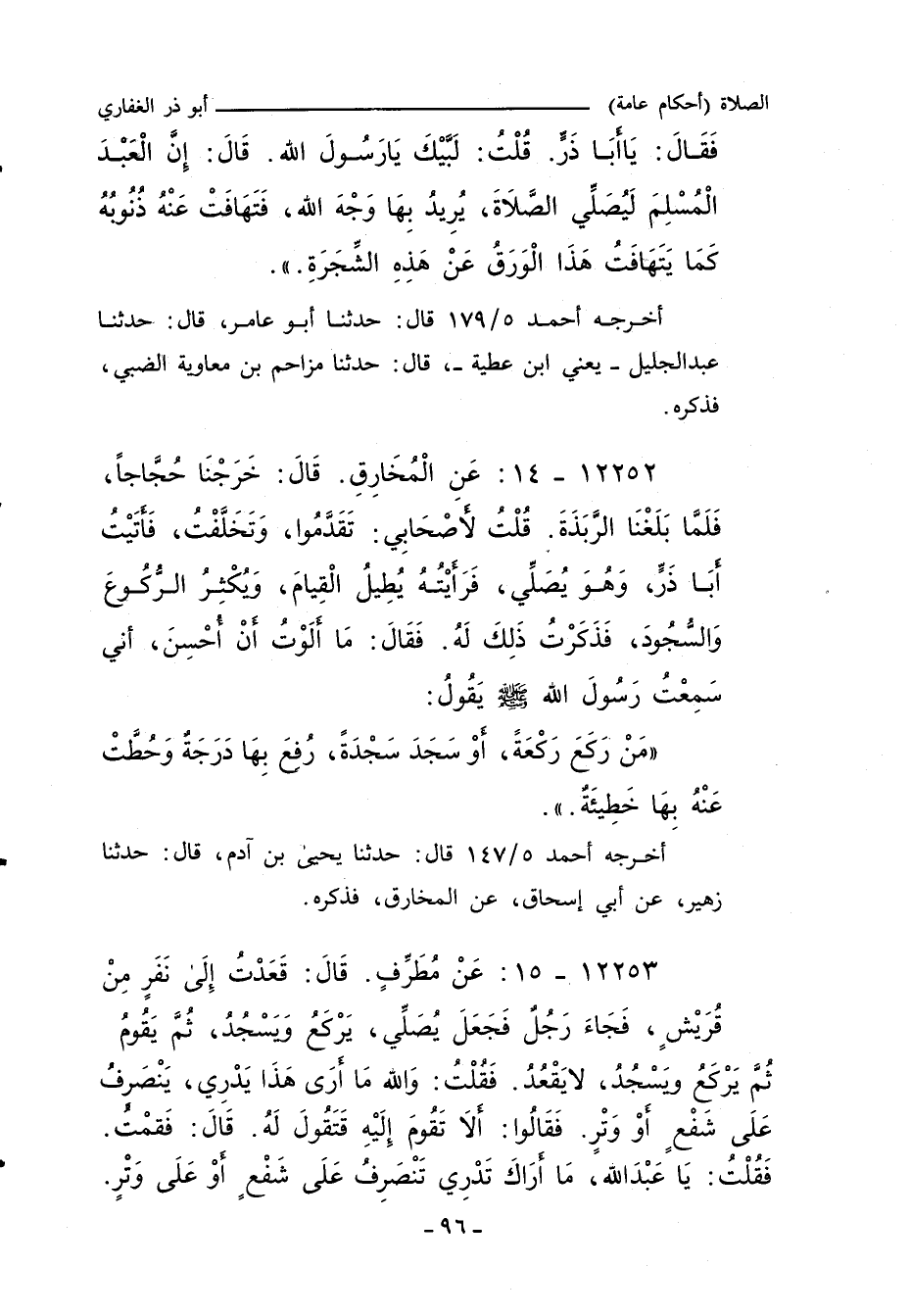 ١٢٢٥٢ - عَنِ الْمُخَارِقِ، قَالَ: خَرَجْنَا حُجَّاجًا، فَلَمَّا بَلَغْنَا الرَّبَذَةَ، قُلْتُ لأَصْحَابِي: تَقَدَّمُوا، وَتَخَلَّفْتُ، فَأَتَيْتُ أَبَا ذَرٍّ وَهُوَ يُصَلِّي، فَرَأَيْتُهُ يُطِيلُ الْقِيَامَ، وَيُكْثِرُ الرُّكُوعَ وَالسُّجُودَ، فَذَكَرْتُ ذَلِكَ لَهُ، فَقَالَ: مَا أَلَوْتُ أَنْ أُحْسِنَ، إِنِّي سَمِعْتُ رَسُولَ اللهِ صلى الله عليه وسلم يَقُولُ: