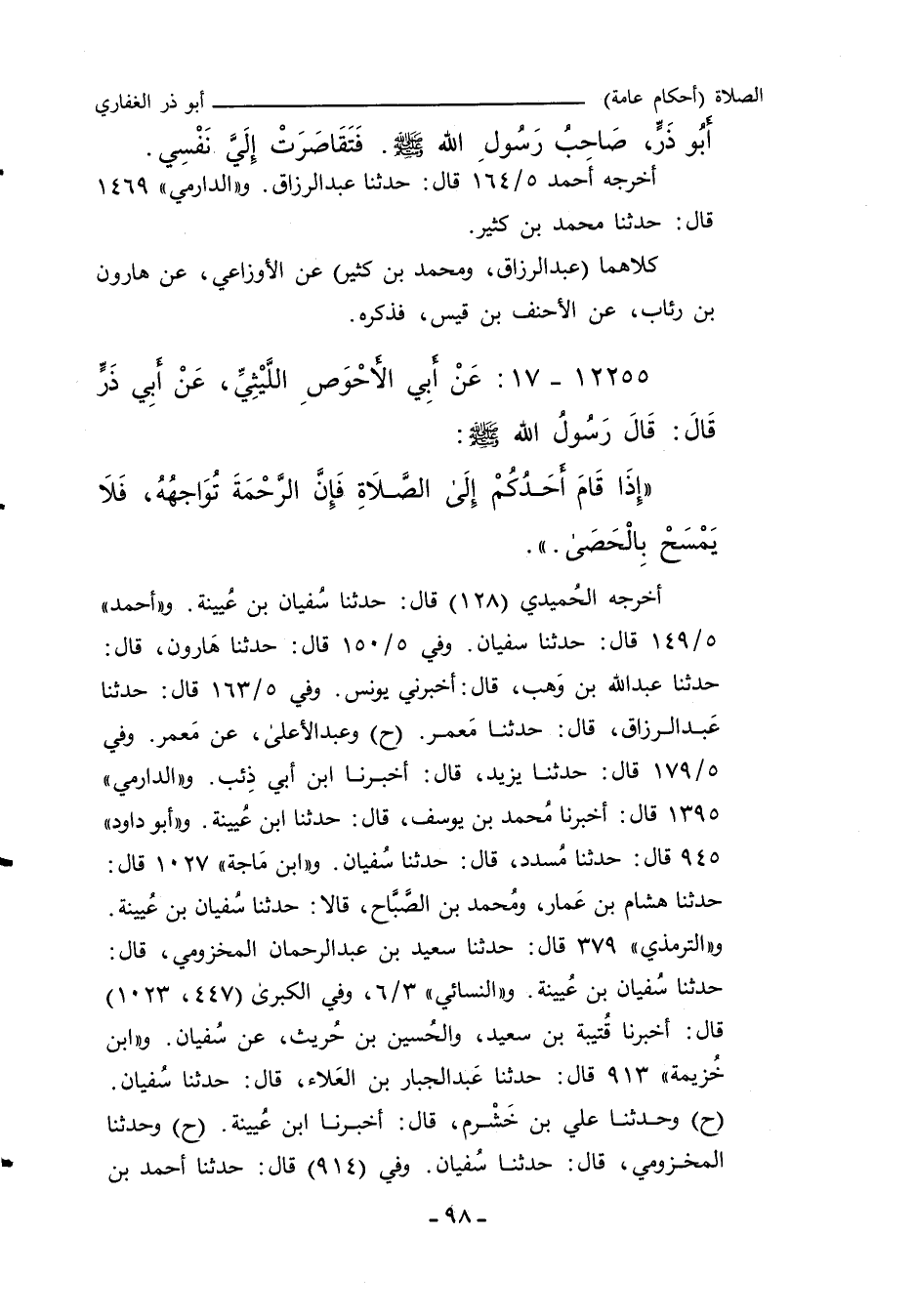 - وفي رواية: إِذَا قَامَ أَحَدُكُمْ إِلَى الصَّلَاةِ اسْتَقْبَلَتْهُ الرَّحْمَةُ، فَلَا يَمَسَّ الْحَصَى وَلَا يُحَرِّكْهَا.