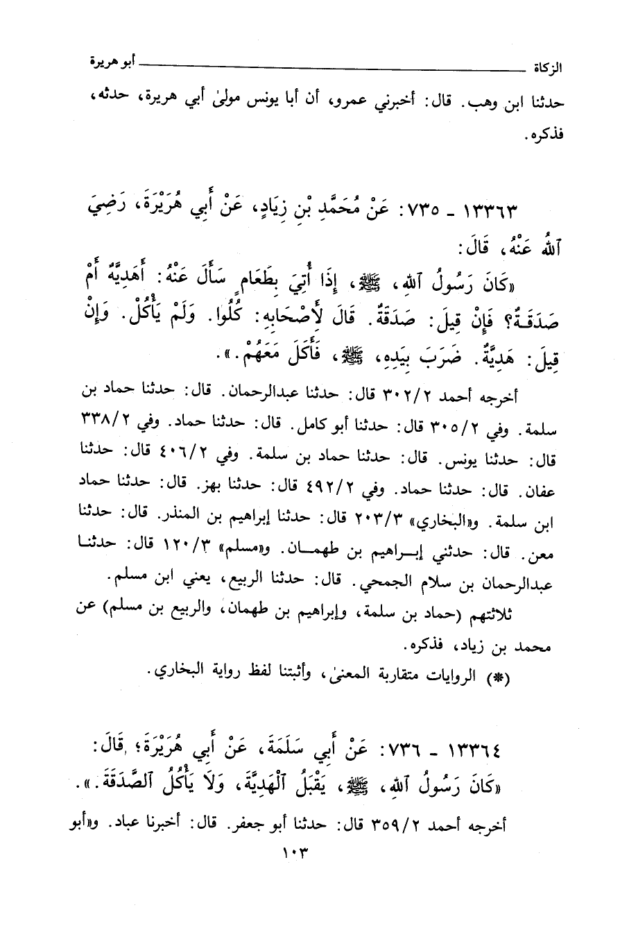 ـ وفي رواية: كَانَ رَسُولُ اللهِ صلى الله عليه وسلم إِذَا أُتِيَ بِطَعَامٍ سَأَلَ عَنْهُ: أَهَدِيَّةٌ أَمْ صَدَقَةٌ؟ فَإِنْ قِيلَ: صَدَقَةٌ، قَالَ لأَصْحَابِهِ: كُلُوا، وَلَمْ يَأْكُلْ، وَإِنْ قِيلَ: هَدِيَّةٌ، ضَرَبَ بِيَدِهِ صلى الله عليه وسلم، فَأَكَلَ مَعَهُمْ.