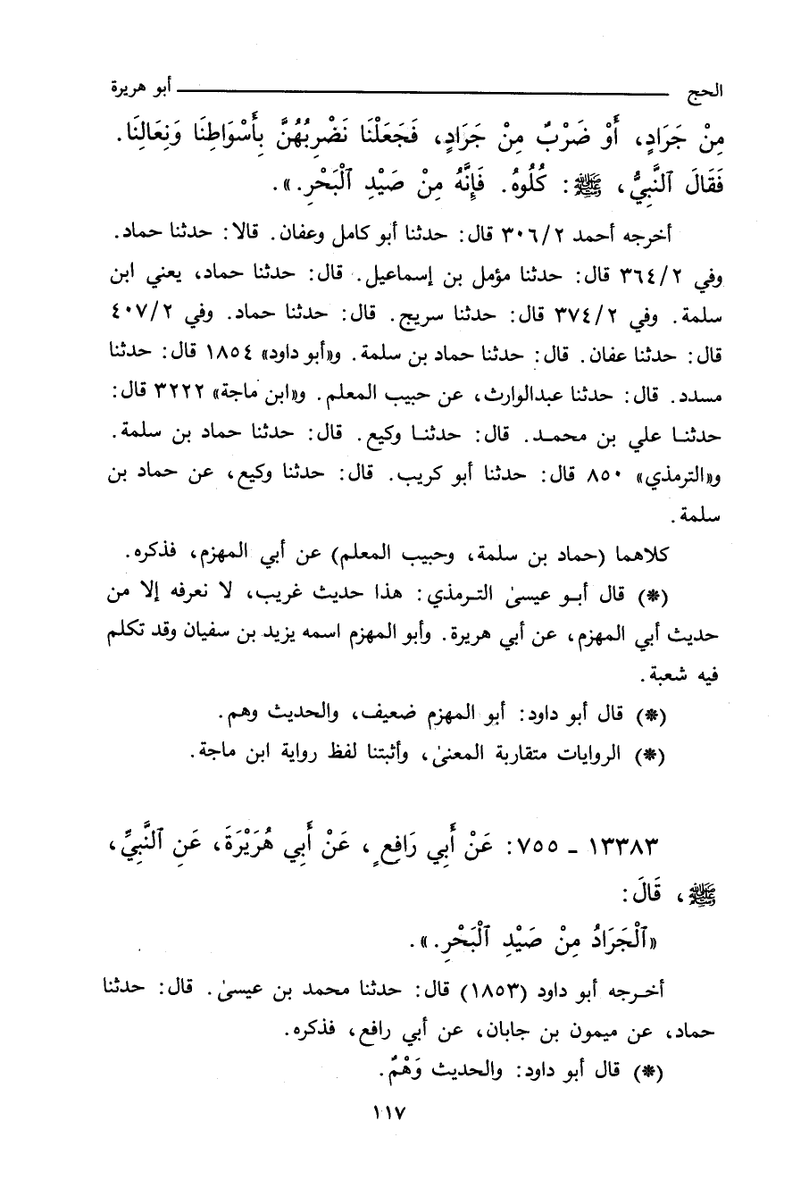 ـ وفي رواية: خَرَجْنَا مَعَ النَّبِيِّ صلى الله عليه وسلم فِي حَجَّةٍ أَوْ عُمْرَةٍ، فَاسْتَقْبَلَنَا رِجْلٌ مِنْ جَرَادٍ، أَوْ ضَرْبٌ مِنْ جَرَادٍ، فَجَعَلْنَا نَضْرِبُهُنَّ بِأَسْوَاطِنَا وَنِعَالِنَا، فَقَالَ النَّبِيُّ صلى الله عليه وسلم: كُلُوهُ، فَإِنَّهُ مِنْ صَيْدِ الْبَحْرِ.