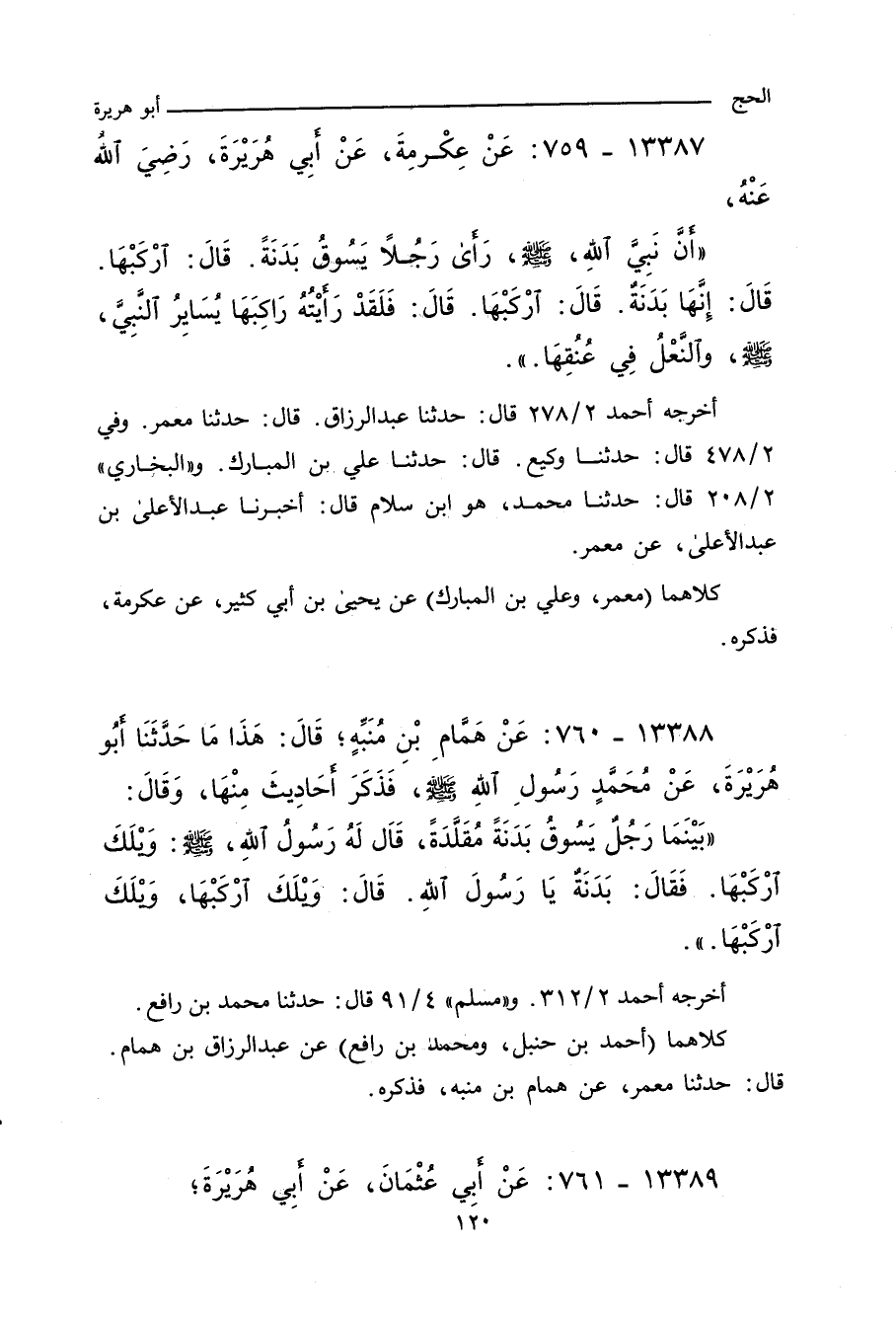 مَرَّ النَّبِيُّ صلى الله عليه وسلم بِرَجُلٍ يَسُوقُ بَدَنَةً، قَالَ النَّبِيُّ صلى الله عليه وسلم: ارْكَبْهَا، قَالَ: إِنَّهَا بَدَنَةٌ، قَالَ: ارْكَبْهَا، قَالَ أَبُو هُرَيْرَةَ: فَلَقَدْ رَأَيْتُهُ يُسَايِرُ النَّبِيَّ صلى الله عليه وسلم، وَفِي عُنُقِهَا نَعْلٌ.