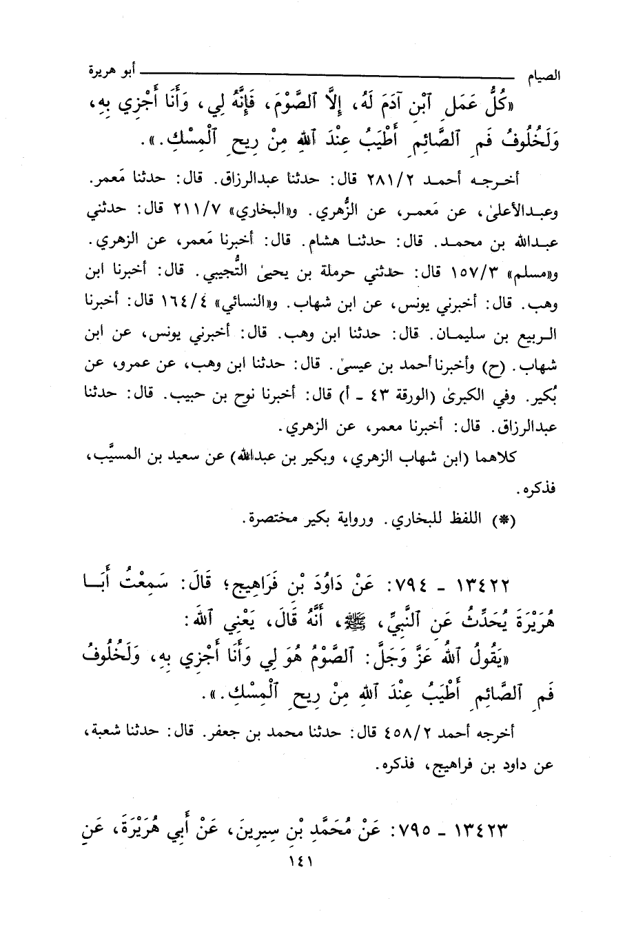 ـ لفظ بكير بن عبد الله: كُلُّ حَسَنَةٍ يَعْمَلُهَا ابْنُ آدَمَ فَلَهُ عَشْرُ أَمْثَالِهَا، إِلَاّ الصِّيَامَ لِي وَأَنَا أَجْزِي بِهِ.