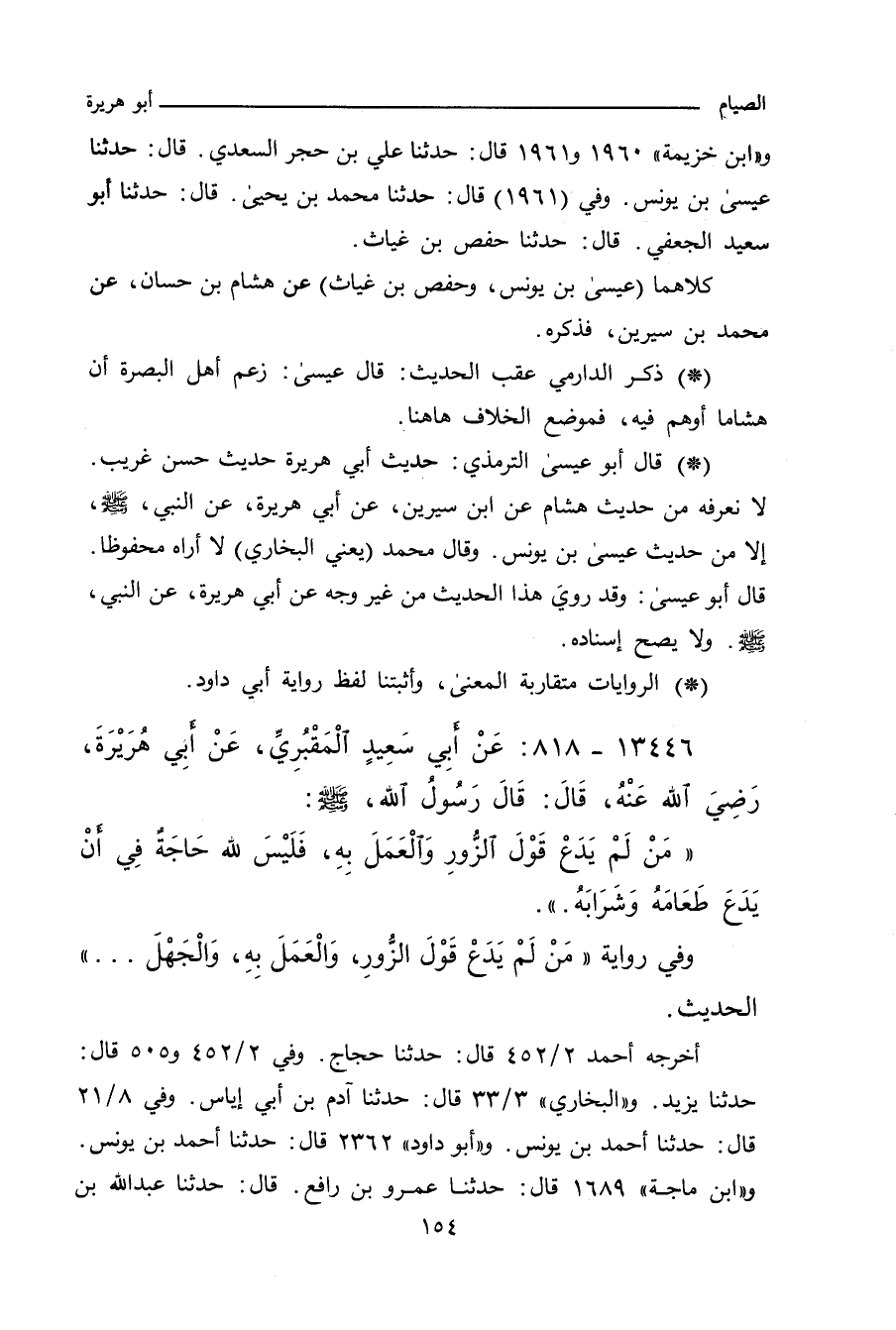 ـ قال أبو عيسى الترمذي: حديث أبي هريرة حديث حسنٌ غريبٌ، لا نعرفه من حديث هشام، عن ابن سيرين، عن أبي هُرَيْرة، عن النبي صلى الله عليه وسلم، إلا من حديث عيسى بن يونس. وقال محمد (يعني البخاري): لا أراه محفوظًا.
