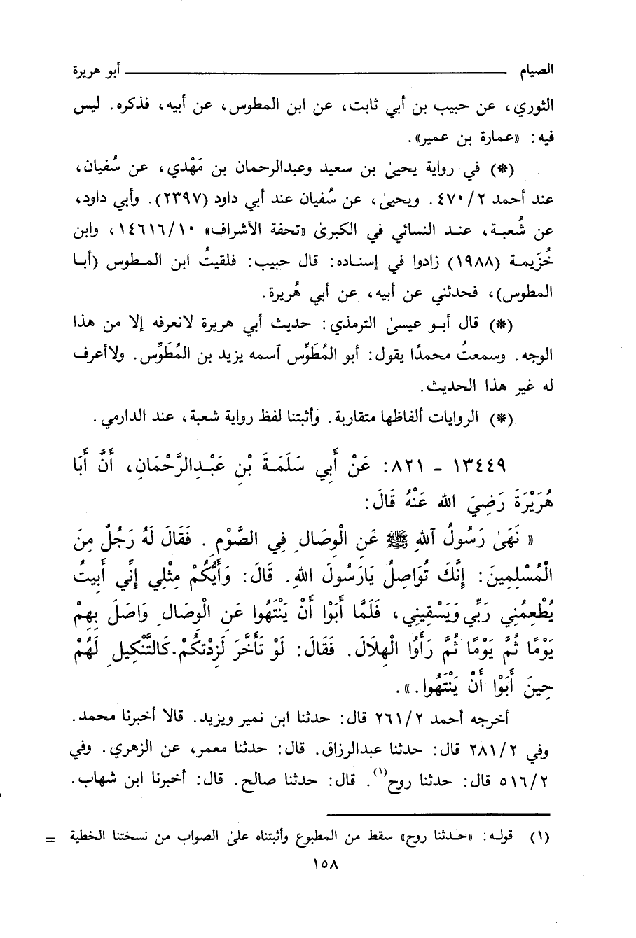 نَهَى رَسُولُ اللهِ صلى الله عليه وسلم عَنِ الْوِصَالِ فِي الصَّوْمِ، فَقَالَ لَهُ رَجُلٌ مِنَ الْمُسْلِمِينَ: إِنَّك تُوَاصِلُ يَا رَسُولَ اللهِ، قَالَ: وَأَيُّكُمْ مِثْلِي، إِنِّي أَبِيتُ يُطْعِمُنِي رَبِّي وَيَسْقِينِ، فَلَمَّا أَبَوْا أَنْ يَنْتَهُوا عَنِ الْوِصَالِ، وَاصَلَ بِهِمْ يَوْمًا، ثُمَّ يَوْمًا، ثُمَّ رَأَوُا الْهِلَالَ، فَقَالَ: لَو تَأَخَّرَ لَزِدْتُكُمْ، كَالتَّنْكِيلِ لَهُمْ، حِينَ أَبَوْا أَنْ يَنْتَهُوا.