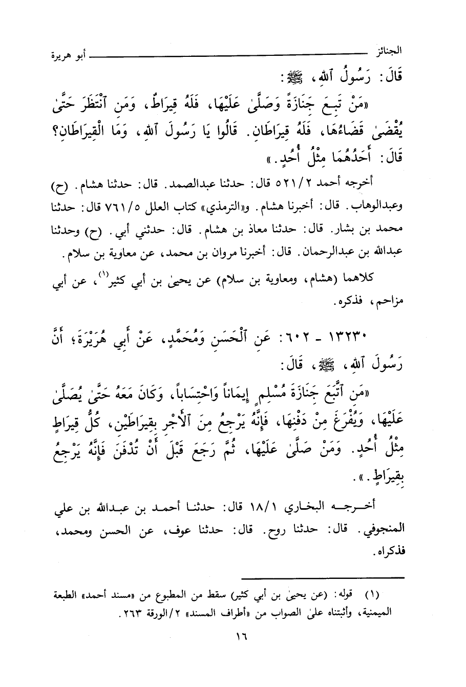 مَنِ اتَّبَعَ جَنَازَةَ مُسْلِمٍ إِيمَانًا وَاحْتِسَابًا، وَكَانَ مَعَهُ حَتَّى يُصَلَّي عَلَيْهَا، وَيَفْرُغَ مِنْ دَفْنِهَا، فَإِنَّهُ يَرْجِعُ مِنَ الأَجْرِ بِقِيرَاطَيْنِ، كُلُّ قِيرَاطٍ مِثْلُ أُحُدٍ، وَمَنْ صَلَّى عَلَيْهَا ثُمَّ رَجَعَ قَبْلَ أَنْ تُدْفَنَ، فَإِنَّهُ يَرْجِعُ بِقِيرَاطٍ.